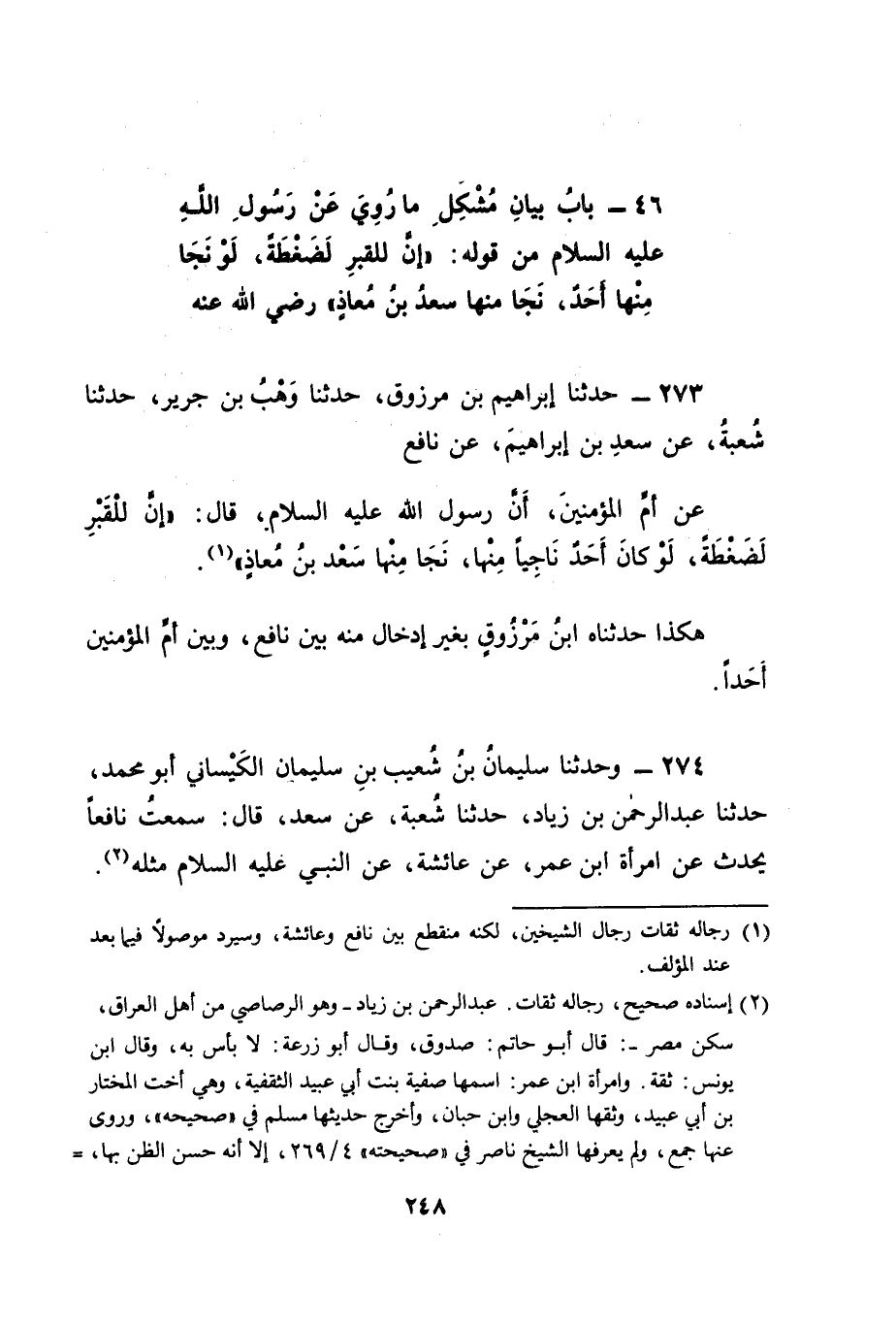 273 - حَدَّثَنَا إبْرَاهِيمُ بْنُ مَرْزُوقٍ، حَدَّثَنَا وَهْبُ بْنُ جَرِيرٍ، حَدَّثَنَا شُعْبَةُ، عَنْ سَعْدِ بْنِ إبْرَاهِيمَ، عَنْ نَافِعٍ، عَنْ أُمِّ الْمُؤْمِنِينَ، أَنَّ رَسُولَ اللهِ عَلَيْهِ السَّلَامُ قَالَ: " إنَّ لِلْقَبْرِ لَضَغْطَةً لَوْ كَانَ أَحَدٌ نَاجِيًا مِنْهَا نَجَا مِنْهَا سَعْدُ بْنُ مُعَاذٍ " هَكَذَا حَدَّثَنَاهُ ابْنُ مَرْزُوقٍ بِغَيْرِ إدْخَالٍ مِنْهُ بَيْنَ نَافِعٍ وَبَيْنَ أُمِّ الْمُؤْمِنِينَ أَحَدًا