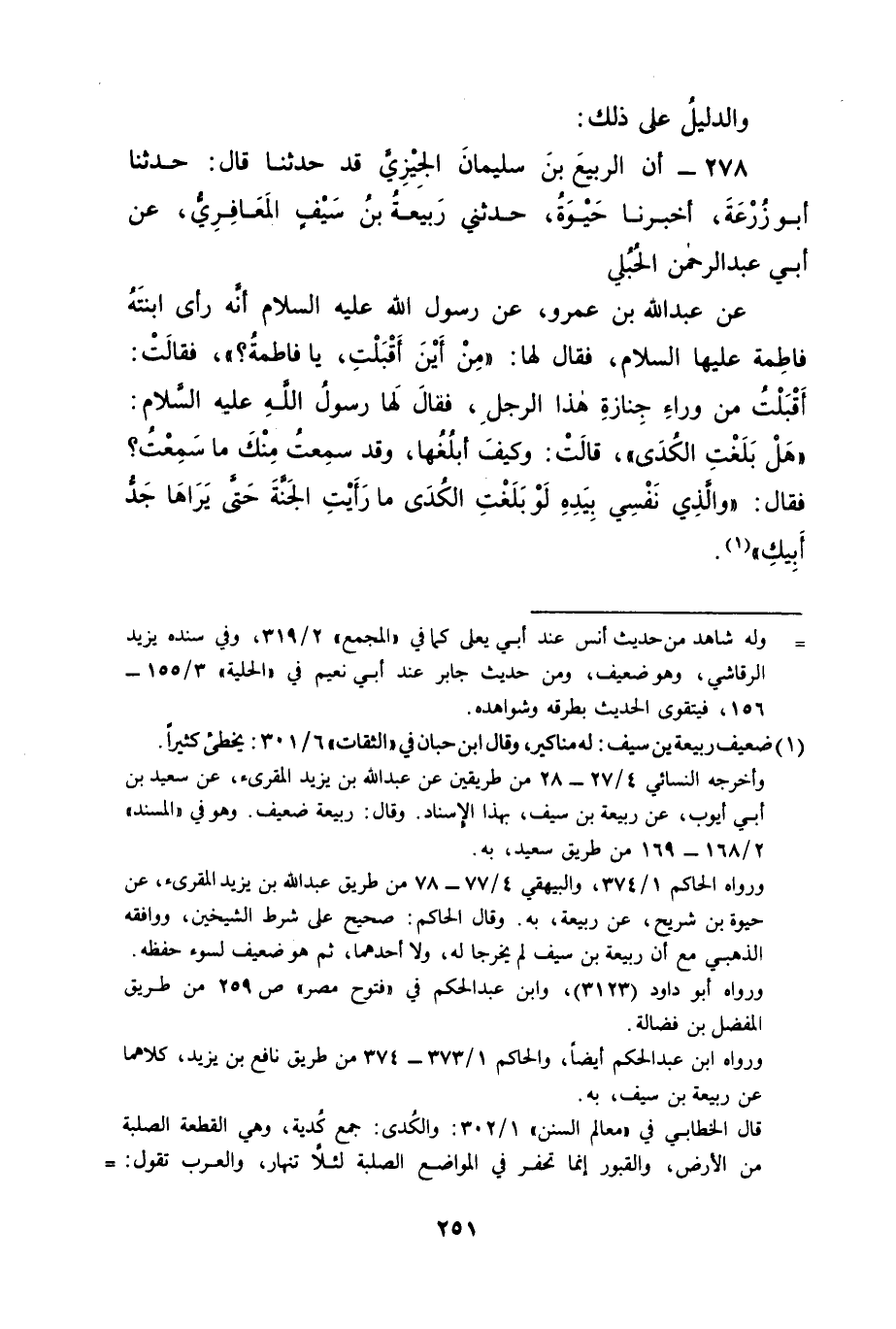 278 - أَنَّ الرَّبِيعَ بْنَ سُلَيْمَانَ الْجِيزِيَّ قَدْ حَدَّثَنَا قَالَ: حَدَّثَنَا أَبُو زُرْعَةَ، أَخْبَرَنَا حَيْوَةُ، حَدَّثَنِي رَبِيعَةُ بْنُ سَيْفٍ الْمَعَافِرِيُّ، عَنْ أَبِي عَبْدِ الرَّحْمَنِ الْحُبُلِيِّ، عَنْ عَبْدِ اللهِ بْنِ عَمْرٍو، عَنْ رَسُولِ اللهِ عَلَيْهِ السَّلَامُ أَنَّهُ رَأَى ابْنَتَهُ فَاطِمَةَ عَلَيْهَا السَّلَامُ فَقَالَ لَهَا: " مِنْ أَيْنَ أَقْبَلْتِ يَا فَاطِمَةُ؟ " فَقَالَتْ: أَقْبَلْتُ مِنْ وَرَاءِ جِنَازَةِ هَذَا الرَّجُلِ فَقَالَ لَهَا رَسُولُ اللهِ عَلَيْهِ السَّلَامُ: " هَلْ بَلَغْتِ الْكُدَى؟ " قَالَتْ: وَكَيْفَ أَبْلُغُهَا وَقَدْ سَمِعْتُ مِنْكَ مَا سَمِعْتُ؟ فَقَالَ: " وَالَّذِي نَفْسِي بِيَدِهِ لَوْ بَلَغْتِ الْكُدَى مَا رَأَيْتِ الْجَنَّةَ حَتَّى يَرَاهَا جَدُّ أَبِيكِ " -[252]- ثُمَّ عُدْنَا إلَى طَلَبِ مَنْ بَيْنَ رَبِيعَةَ بْنِ سَيْفٍ وَبَيْنَ عَبْدِ اللهِ بْنِ عَمْرٍو فِي هَذَا الْحَدِيثِ