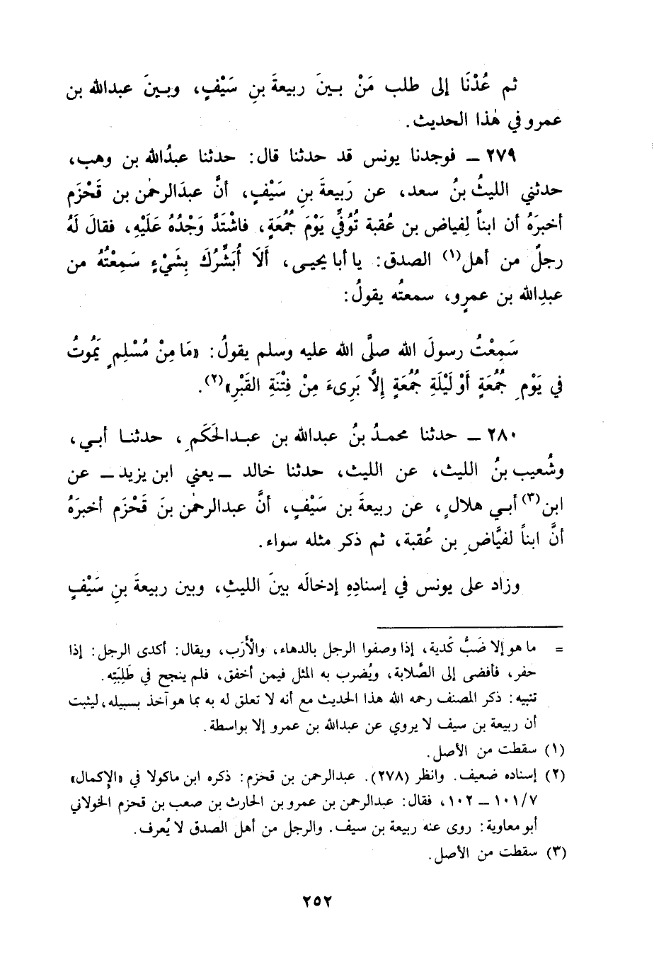 279 - فَوَجَدْنَا يُونُسَ قَدْ حَدَّثَنَا قَالَ: حَدَّثَنَا عَبْدُ اللهِ بْنُ وَهْبٍ، حَدَّثَنِي اللَّيْثُ بْنُ سَعْدٍ، عَنْ رَبِيعَةَ بْنِ سَيْفٍ، أَنَّ عَبْدَ الرَّحْمَنِ بْنَ قَحْزَمٍ أَخْبَرَهُ أَنَّ ابْنًا لِفَيَّاضِ بْنِ عُقْبَةَ تُوُفِّيَ يَوْمَ جُمُعَةٍ فَاشْتَدَّ وَجْدُهُ عَلَيْهِ فَقَالَ لَهُ رَجُلٌ مِنْ أَهْلِ الصِّدْقِ: يَا أَبَا يَحْيَى أَلَا أُبَشِّرُكَ بِشَيْءٍ سَمِعْتُهُ مِنْ عَبْدِ اللهِ بْنِ عَمْرٍو سَمِعْتُهُ يَقُولُ: سَمِعْتُ رَسُولَ اللهِ صَلَّى اللَّهُ عَلَيْهِ وَسَلَّمَ يَقُولُ: " مَا مِنْ مُسْلِمٍ يَمُوتُ فِي يَوْمِ جُمُعَةٍ أَوْ لَيْلَةِ جُمُعَةٍ إلَّا بَرِئَ مِنْ فِتْنَةِ الْقَبْرِ "
