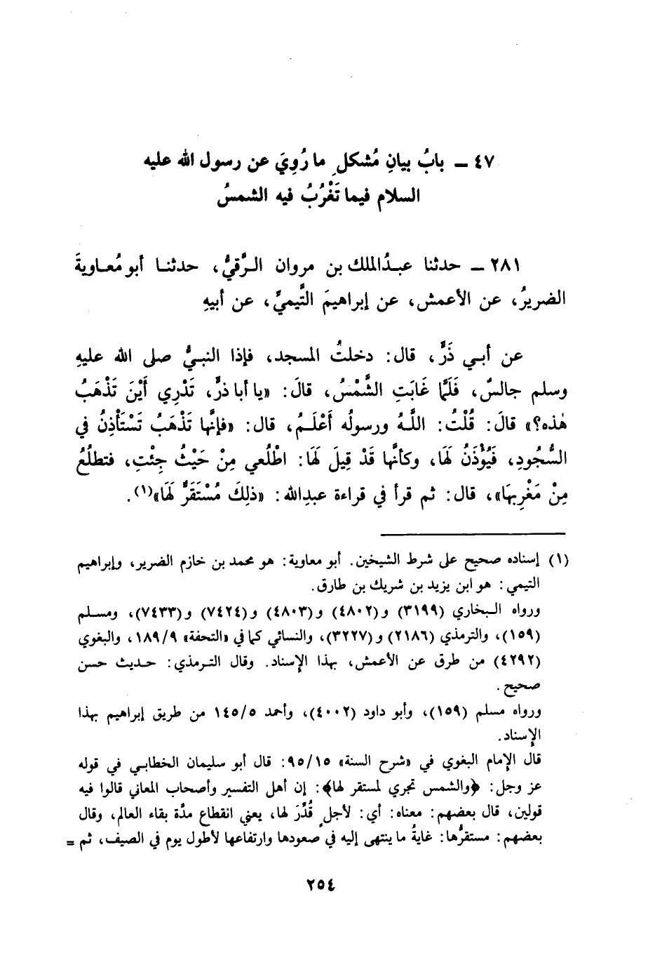 281 - حَدَّثَنَا عَبْدُ الْمَلِكِ بْنُ مَرْوَانَ الرَّقِّيُّ، حَدَّثَنَا أَبُو مُعَاوِيَةَ الضَّرِيرُ، عَنِ الْأَعْمَشِ، عَنْ إبْرَاهِيمَ التَّيْمِيِّ، عَنْ أَبِيهِ، عَنْ أَبِي ذَرٍّ، قَالَ: دَخَلْتُ الْمَسْجِدَ فَإِذَا النَّبِيُّ صَلَّى اللَّهُ عَلَيْهِ وَسَلَّمَ جَالِسٌ فَلَمَّا غَابَتِ الشَّمْسُ قَالَ: " يَا أَبَا ذَرٍّ تَدْرِي أَيْنَ تَذْهَبُ هَذِهِ؟ " قَالَ: قُلْتُ: اللهُ وَرَسُولُهُ أَعْلَمُ قَالَ: " فَإِنَّهَا تَذْهَبُ تَسْتَأْذِنُ فِي السُّجُودِ فَيُؤْذَنُ لَهَا وَكَأَنَّهَا قَدْ قِيلَ لَهَا اطْلُعِي مِنْ حَيْثُ جِئْتِ فَتَطْلُعُ مِنْ مَغْرِبِهَا " قَالَ: ثُمَّ قَرَأَ فِي قِرَاءَةِ عَبْدِ اللهِ: " ذَلِكَ مُسْتَقَرٌّ لَهَا " -[255]- فَفِي هَذَا مَا يَدُلُّ عَلَى أَنَّ الشَّمْسَ تَغْرُبُ فِي السَّمَاءِ. وَقَدْ رُوِيَ عَنْ رَسُولِ اللهِ صَلَّى اللَّهُ عَلَيْهِ وَسَلَّمَ أَيْضًا فِيمَا تَغْرُبُ فِيهِ