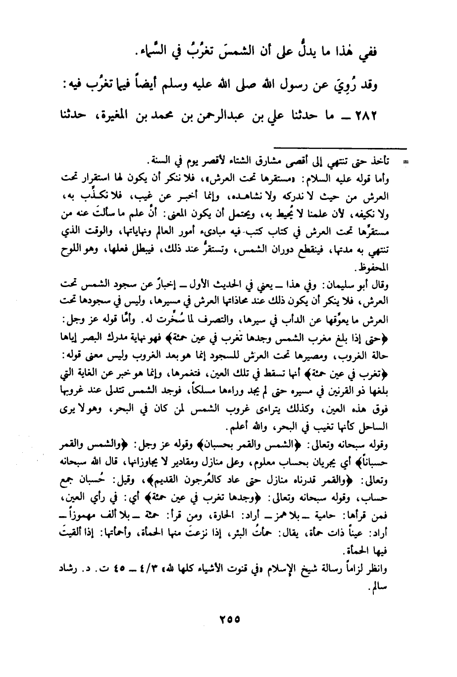 282 - مَا حَدَّثَنَا عَلِيُّ بْنُ عَبْدِ الرَّحْمَنِ بْنِ مُحَمَّدِ بْنِ الْمُغِيرَةَ، حَدَّثَنَا -[256]- عَبْدُ الْغَفَّارِ بْنُ دَاوُدَ الْحَرَّانِيُّ، حَدَّثَنَا حَمَّادُ بْنُ سَلَمَةَ، عَنْ عَبْدِ اللهِ بْنِ عُثْمَانَ بْنِ خُثَيْمٍ، عَنْ سَعِيدِ بْنِ جُبَيْرٍ، عَنِ ابْنِ عَبَّاسٍ، عَنِ النَّبِيِّ عَلَيْهِ السَّلَامُ أَنَّهُ قَرَأَ " {فِي عَيْنٍ حَمِئَةٍ} [الكهف: 86] " وَكَأَنَّ هَذَا الْحَدِيثَ مِمَّا لَمْ يَرْفَعْهُ أَحَدٌ مِنْ حَدِيثِ حَمَّادِ بْنِ سَلَمَةَ غَيْرُ عَبْدِ الْغَفَّارِ بْنِ دَاوُدَ , وَهُوَ مِمَّا يُخَطِّئُهُ فِيهِ أَهْلُ الْحَدِيثِ وَيَقُولُونَ: إنَّهُ مَوْقُوفٌ عَلَى ابْنِ عَبَّاسٍ وَقَدْ خَالَفَهُ فِيهِ أَصْحَابُ حَمَّادٍ فَلَمْ يَرْفَعُوهُ فَمِمَّنْ خَالَفَهُ فِيهِ مِنْهُمْ خَالِدُ بْنُ عَبْدِ الرَّحْمَنِ الْخُرَاسَانِيُّ وَحَجَّاجُ بْنُ مِنْهَالٍ الْأَنْمَاطِيُّ