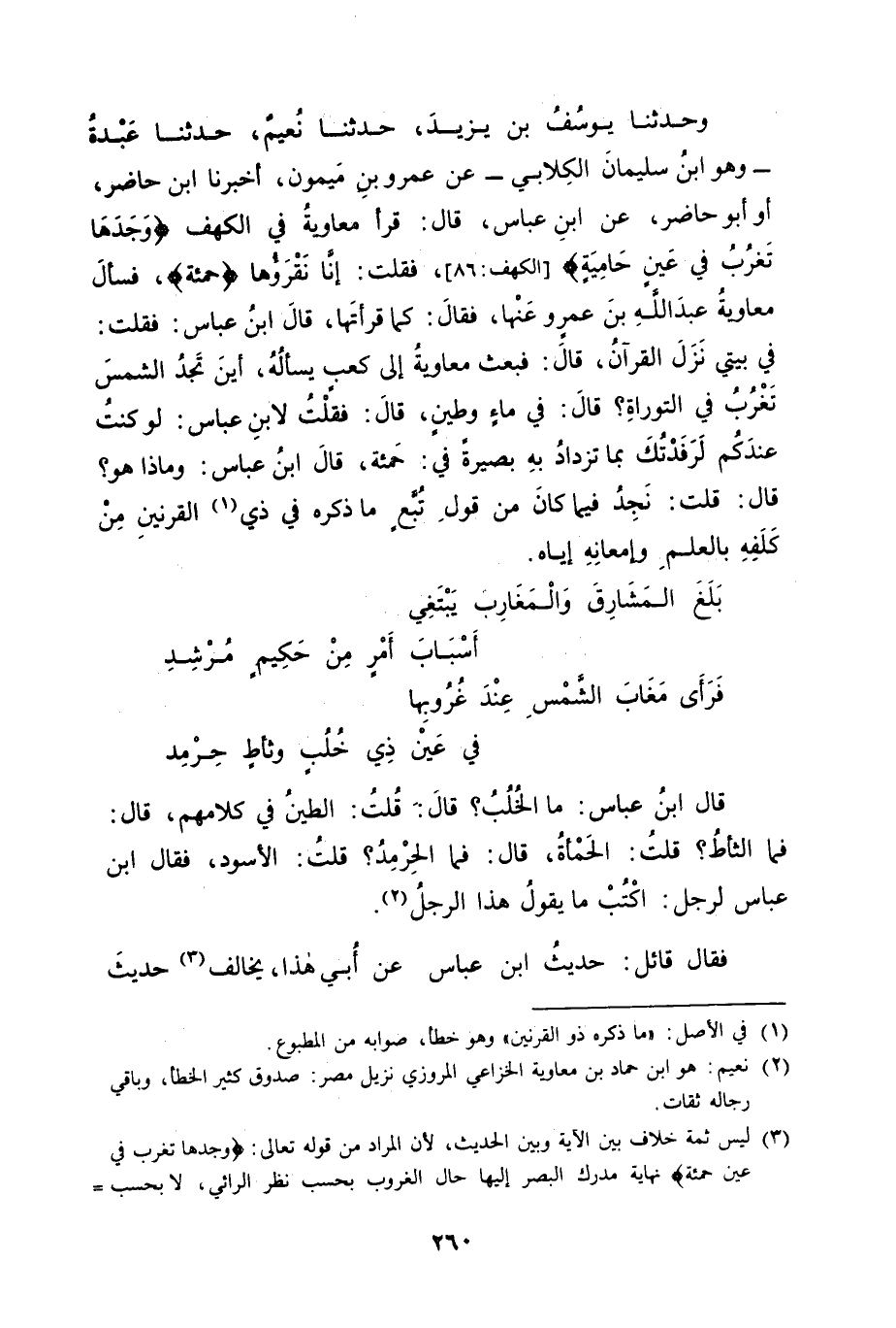 وَحَدَّثَنَا يُوسُفُ بْنُ يَزِيدَ , حَدَّثَنَا نُعَيْمٌ , حَدَّثَنَا عَبْدَةُ وَهُوَ ابْنُ سُلَيْمَانَ الْكِلَابِيُّ , عَنْ عَمْرِو بْنِ مَيْمُونٍ , أَحْبَرَنَا ابْنُ حَاضِرٍ أَوْ أَبُو حَاضِرٍ , عَنِ ابْنِ عَبَّاسٍ قَالَ: " قَرَأَ مُعَاوِيَةُ فِي الْكَهْفِ (وَجَدَهَا تَغْرُبُ فِي عَيْنٍ حَامِيَةٍ) فَقُلْتُ: إنَّا نَقْرَؤُهَا {حَمِئَةٍ} [الكهف: 86] " فَسَأَلَ مُعَاوِيَةُ عَبْدَ اللهِ بْنَ عَمْرٍو عَنْهَا فَقَالَ: كَمَا قَرَأْتَهَا قَالَ ابْنُ عَبَّاسٍ: فَقُلْتُ: " فِي بَيْتِي نَزَلَ الْقُرْآنُ " قَالَ: فَبَعَثَ مُعَاوِيَةُ إلَى كَعْبٍ يَسْأَلُهُ أَيْنَ تَجِدُ الشَّمْسَ تَغْرُبُ فِي التَّوْرَاةِ؟ قَالَ: فِي مَاءٍ وَطِينٍ قَالَ: فَقُلْتُ: لِابْنِ عَبَّاسٍ لَوْ كُنْتُ عِنْدَكُمْ لَرَفَدْتُكَ بِمَا تَزْدَادُ بِهِ بَصِيرَةً فِي حَمِئَةٍ قَالَ ابْنُ عَبَّاسٍ: " وَمَاذَا هُوَ؟ " قَالَ: قُلْتُ: نَجُدُ فِيمَا كَانَ مِنْ قَوْلِ تُبَّعٍ مَا ذَكَرَهُ فِي ذِي الْقَرْنَيْنِ مِنْ كَلَفِهِ بِالْعِلْمِ وَإِمْعَانِهِ إيَّاهُ.