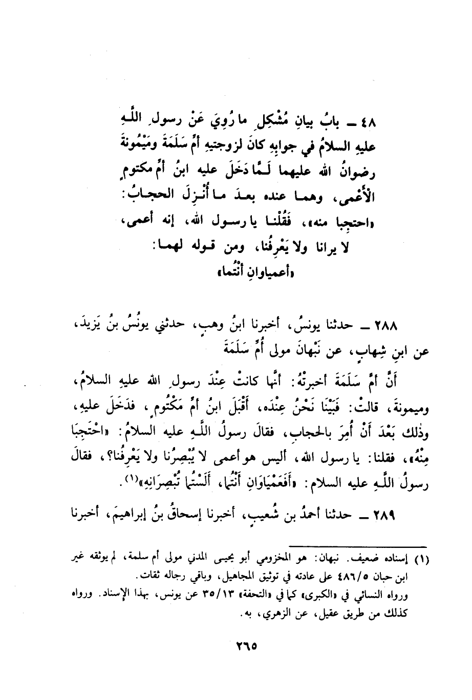 288 - حَدَّثَنَا يُونُسُ، أَخْبَرَنَا ابْنُ وَهْبٍ، حَدَّثَنِي يُونُسُ بْنُ يَزِيدَ، عَنِ ابْنِ شِهَابٍ، عَنْ نَبْهَانَ مَوْلَى أُمِّ سَلَمَةَ أَنَّ أُمَّ سَلَمَةَ أَخْبَرَتْهُ أَنَّهَا كَانَتْ عِنْدَ رَسُولِ اللهِ عَلَيْهِ السَّلَامُ وَمَيْمُونَةَ , قَالَتْ: فَبَيْنَا نَحْنُ عِنْدَهُ أَقْبَلَ ابْنُ أُمِّ مَكْتُومٍ فَدَخَلَ عَلَيْهِ , وَذَلِكَ بَعْدَ أَنْ أُمِرَ بِالْحِجَابِ فَقَالَ رَسُولُ اللهِ عَلَيْهِ السَّلَامُ: " احْتَجِبَا مِنْهُ " فَقُلْنَا: يَا رَسُولَ اللهِ أَلَيْسَ هُوَ أَعْمَى لَا يُبْصِرُنَا وَلَا يَعْرِفُنَا؟ فَقَالَ رَسُولُ اللهِ عَلَيْهِ السَّلَامُ " أَفَعَمْيَاوَانِ أَنْتُمَا أَلَسْتُمَا تُبْصِرَانِهِ "