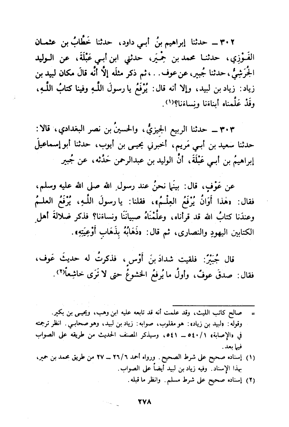 303 - حَدَّثَنَا الرَّبِيعُ الْجِيزِيُّ، وَالْحُسَيْنُ بْنُ نَصْرٍ الْبَغْدَادِيُّ، قَالَا: حَدَّثَنَا سَعِيدُ بْنُ أَبِي مَرْيَمَ، أَخْبَرَنِي يَحْيَى بْنُ أَيُّوبَ، حَدَّثَنَا أَبُو إسْمَاعِيلَ إبْرَاهِيمُ بْنُ أَبِي عَبْلَةَ أَنَّ الْوَلِيدَ بْنَ عَبْدِ الرَّحْمَنِ حَدَّثَهُ , عَنْ جُبَيْرٍ، عَنْ عَوْفٍ، قَالَ: بَيْنَمَا نَحْنُ عِنْدَ رَسُولِ اللهِ صَلَّى اللَّهُ عَلَيْهِ وَسَلَّمَ فَقَالَ: " هَذَا أَوَانُ يُرْفَعُ الْعِلْمُ " فَقُلْنَا: يَا رَسُولَ اللهِ يُرْفَعُ الْعِلْمُ وَعِنْدَنَا كِتَابُ اللهِ قَدْ قَرَأْنَاهُ وَعَلَّمْنَاهُ صِبْيَانَنَا وَنِسَاءَنَا؟ فَذَكَرَ ضَلَالَةَ أَهْلِ الْكِتَابَيْنِ الْيَهُودِ وَالنَّصَارَى , ثُمَّ قَالَ: " ذَهَابُهُ بِذَهَابِ أَوْعِيَتِهِ " قَالَ جُبَيْرٌ: فَلَقِيتُ شَدَّادَ بْنَ أَوْسٍ فَذَكَرْتُ لَهُ حَدِيثَ عَوْفٍ فَقَالَ: صَدَقَ عَوْفٌ وَأَوَّلُ مَا يُرْفَعُ الْخُشُوعُ حَتَّى لَا تَرَى خَاشِعًا