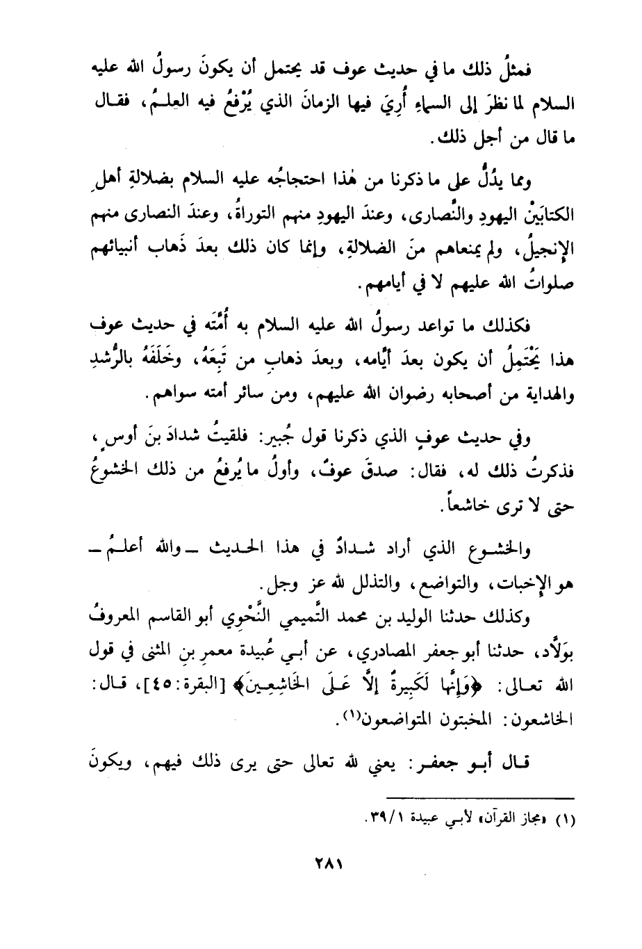 وَكَذَلِكَ حَدَّثَنَا الْوَلِيدُ بْنُ مُحَمَّدٍ التَّمِيمِيُّ النَّحْوِيُّ أَبُو الْقَاسِمِ الْمَعْرُوفُ بِوَلَّادٍ , حَدَّثَنَا أَبُو جَعْفَرٍ الْمَصَادِرِيُّ , عَنْ أَبِي عُبَيْدَةَ مَعْمَرِ بْنِ الْمُثَنَّى فِي قَوْلِ اللهِ تَعَالَى: {وَإِنَّهَا لَكَبِيرَةٌ إلَّا عَلَى الْخَاشِعِينَ} [البقرة: 45] قَالَ: الْخَاشِعُونَ الْمُخْبِتُونَ الْمُتَوَاضِعُونَ قَالَ أَبُو جَعْفَرٍ: يَعْنِي لِلَّهِ تَعَالَى حَتَّى يَرَى ذَلِكَ فِيهِمْ وَيَكُونَ -[282]- عَلَامَةً لَهُمْ كَمَا قَالَ تَعَالَى فِي وَصْفِهِ أَصْحَابَ نَبِيِّهِ: {وَالَّذِينَ مَعَهُ أَشِدَّاءُ عَلَى الْكُفَّارِ} [الفتح: 29] إلَى قَوْلِهِ: {سِيمَاهُمْ فِي وُجُوهِهِمْ مِنْ أَثَرِ السُّجُودِ} [الفتح: 29] وَأَثَرُ السُّجُودِ فِيمَا قَدْ رُوِيَ عَنِ الْمُتَقَدِّمِينَ
