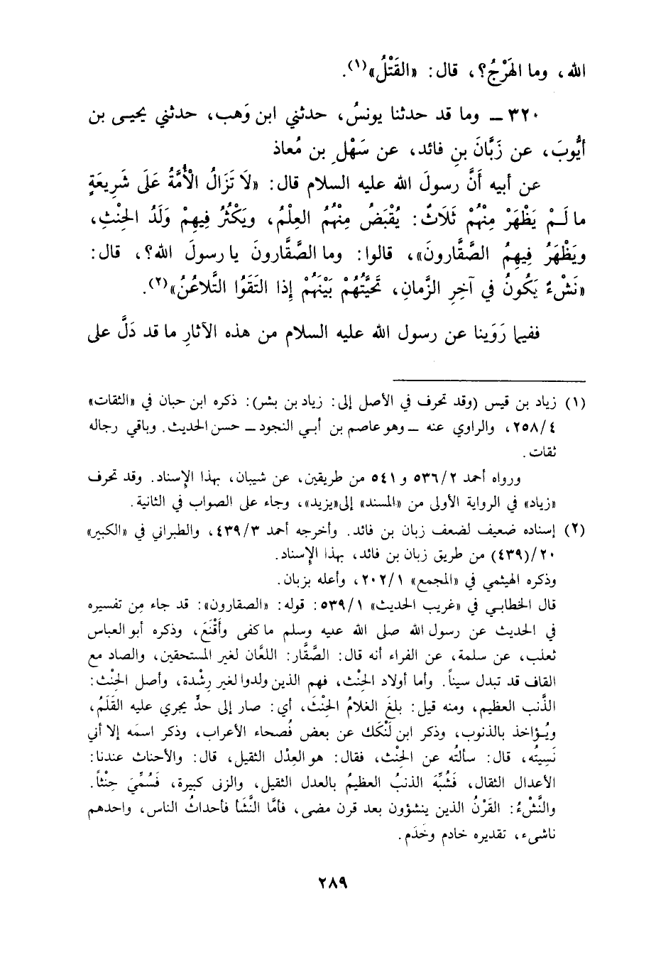 320 - وَمَا قَدْ حَدَّثَنَا يُونُسُ، حَدَّثَنِي ابْنُ وَهْبٍ، حَدَّثَنِي يَحْيَى بْنُ أَيُّوبَ، عَنْ زَبَّانَ بْنِ فَائِدٍ، عَنْ سَهْلِ بْنِ مُعَاذٍ، عَنْ أَبِيهِ، أَنَّ رَسُولَ اللهِ عَلَيْهِ السَّلَامُ قَالَ: " لَا تَزَالُ الْأُمَّةُ عَلَى شَرِيعَةٍ مَا لَمْ يَظْهَرْ مِنْهُمْ ثَلَاثٌ: يُقْبَضُ مِنْهُمُ الْعِلْمُ وَيَكْثُرُ فِيهِمْ وَلَدُ الْحِنْثِ وَيَظْهَرُ فِيهِمُ الصَّقَّارُونَ " قَالُوا: وَمَا الصَّقَّارُونَ يَا رَسُولَ اللهِ؟ قَالَ: " نَشْءٌ يَكُونُ فِي آخِرِ الزَّمَانِ تَحِيَّتُهُمْ بَيْنَهُمْ إذَا الْتَقَوَا التَّلَاعُنُ " فَفِيمَا رَوَيْنَا عَنْ رَسُولِ اللهِ عَلَيْهِ السَّلَامُ مِنْ هَذِهِ الْآثَارِ مَا قَدْ دَلَّ عَلَى -[290]- أَنَّ أَوَانَ رَفْعِ الْعِلْمِ هُوَ عَلَى زَمَانٍ لَمْ يَكُنْ حِينَ قَالَ رَسُولُ اللهِ عَلَيْهِ السَّلَامُ فِيهِ مَا قَالَ وَإِنَّمَا هُوَ عَلَى زَمَانٍ يَكُونُ بَيْنَ يَدَيِ السَّاعَةِ فَقَدِ اتَّفَقَتْ آثَارُ رَسُولِ اللهِ عَلَيْهِ السَّلَامُ كُلُّهَا الَّتِي رَوَيْنَا فِي هَذَا الْبَابِ وَيَصْدُقُ بَعْضُهَا بَعْضًا وَبِاللهِ التَّوْفِيقَ