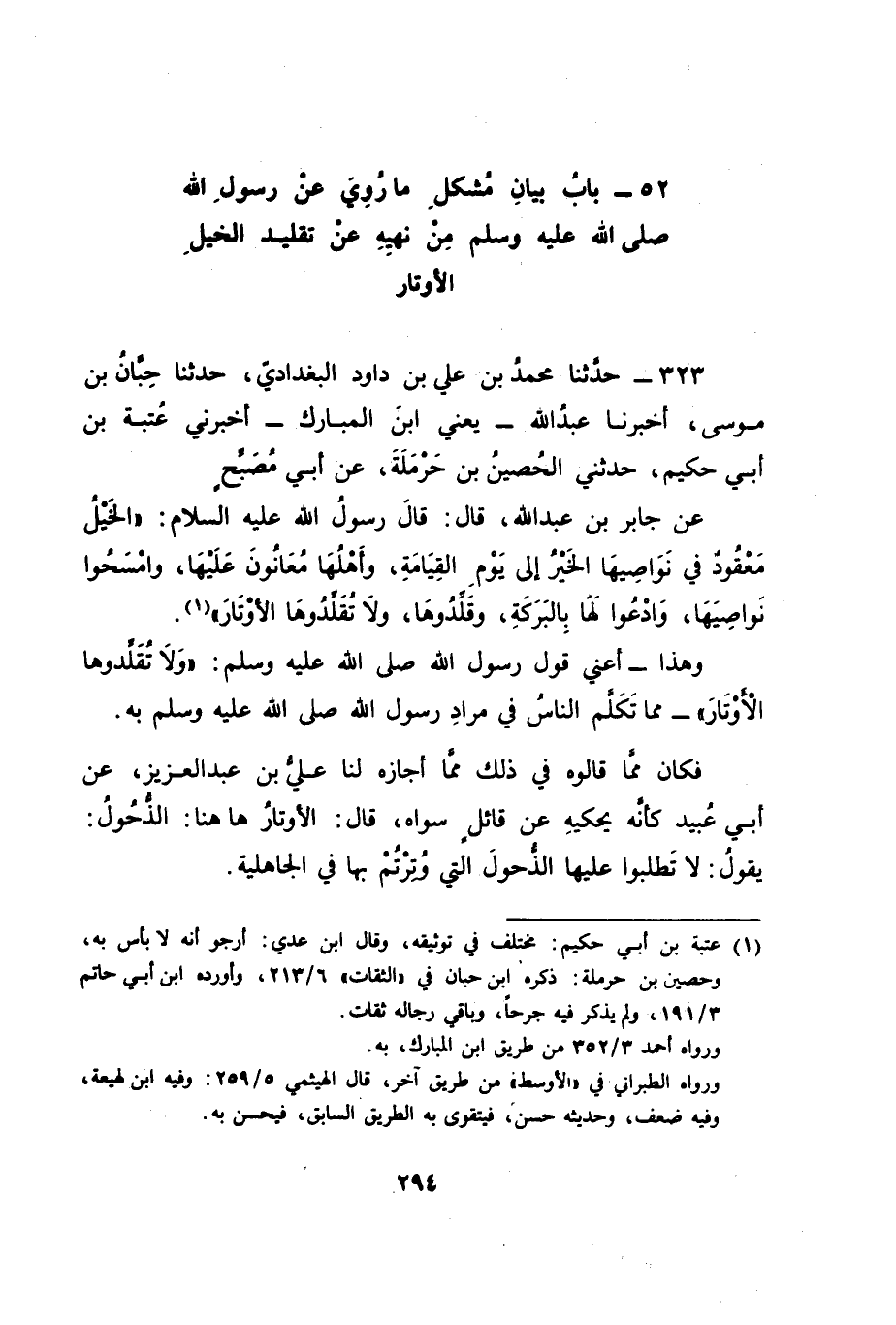 323 - حَدَّثَنَا مُحَمَّدُ بْنُ عَلِيِّ بْنِ دَاوُدَ الْبَغْدَادِيُّ، حَدَّثَنَا حِبَّانُ بْنُ مُوسَى، أَخْبَرَنَا عَبْدُ اللهِ يَعْنِي ابْنَ الْمُبَارَكِ، أَخْبَرَنِي عُتْبَةُ بْنُ أَبِي حَكِيمٍ، حَدَّثَنِي الْحُصَيْنُ بْنُ حَرْمَلَةَ، عَنْ أَبِي مُصَبِّحٍ، عَنْ جَابِرِ بْنِ عَبْدِ اللهِ، قَالَ: قَالَ رَسُولُ اللهِ عَلَيْهِ السَّلَامُ: " الْخَيْلُ مَعْقُودٌ فِي نَوَاصِيهَا الْخَيْرُ إلَى يَوْمِ الْقِيَامَةِ وَأَهْلُهَا مُعَانُونَ عَلَيْهَا وَامْسَحُوا نَوَاصِيَهَا وَادْعُوا لَهَا بِالْبَرَكَةِ وَقَلِّدُوهَا وَلَا تُقَلِّدُوهَا الْأَوْتَارَ " وَهَذَا أَعْنِي قَوْلَ رَسُولِ اللهِ صَلَّى اللَّهُ عَلَيْهِ وَسَلَّمَ: " وَلَا تُقَلِّدُوهَا الْأَوْتَارَ " مِمَّا تَكَلَّمَ النَّاسُ فِي مُرَادِ رَسُولِ اللهِ صَلَّى اللَّهُ عَلَيْهِ وَسَلَّمَ بِهِ فَكَانَ مِمَّا قَالُوهُ فِي ذَلِكَ مِمَّا أَجَازَهُ لَنَا عَلِيُّ بْنُ عَبْدِ الْعَزِيزِ عَنْ أَبِي عُبَيْدٍ كَأَنَّهُ يَحْكِيهِ عَنْ قَائِلٍ سِوَاهُ قَالَ: الْأَوْتَارُ هَاهُنَا الذُّحُولُ يَقُولُ: لَا تَطْلُبُوا عَلَيْهَا الذُّحُولَ الَّتِي وُتِرْتُمْ بِهَا فِي الْجَاهِلِيَّةِ -[295]- قَالَ أَبُو عُبَيْدٍ: وَغَيْرُ هَذَا أَشْبَهُ عِنْدِي بِالصَّوَابِ , سَمِعْتُ مُحَمَّدَ بْنَ الْحَسَنِ يَقُولُ: مَعْنَاهُ الْأَوْتَارُ وَكَانُوا يُقَلِّدُونَهَا إيَّاهَا فَتُخْنَقُ بِهَا قَالَ: وَمِمَّا يُصَدِّقُ ذَلِكَ حَدِيثُ هُشَيْمٍ عَنْ أَبِي بِشْرٍ عَنْ سُلَيْمَانَ الْيَشْكُرِيِّ عَنْ جَابِرٍ أَنَّ النَّبِيَّ عَلَيْهِ السَّلَامُ " أَمَرَ بِقَطْعِ الْأَوْتَارِ مِنْ أَعْنَاقِ الْخَيْلِ " قَالَ أَبُو عُبَيْدٍ: وَبَلَغَنِي عَنْ مَالِكٍ أَنَّهُ قَالَ: إنَّمَا كَانَ ذَلِكَ يُفْعَلُ بِهَا مَخَافَةَ الْعَيْنِ عَلَيْهَا حَدَّثَنِي بِهِ عَنْهُ أَبُو الْمُنْذِرِ الْوَاسِطِيُّ إسْمَاعِيلُ بْنُ عُمَرَ فَأَمَرَهُمُ النَّبِيُّ عَلَيْهِ السَّلَامُ بِقَطْعِهَا ; لِأَنَّهَا لَا تَرُدُّ مِنْ قَدَرِ اللهِ عَزَّ وَجَلَّ شَيْئًا. قَالَ أَبُو عُبَيْدٍ: وَهَذَا يُشْبِهُ مَا كَانُوا يَفْعَلُونَهُ بِالتَّمَائِمِ. قَالَ أَبُو جَعْفَرٍ: فَأَمَّا مَا حَكَاهُ أَبُو عُبَيْدٍ عَنْ أَبِي الْمُنْذِرِ عَنْ مَالِكٍ فِي تَأْوِيلِ هَذَا الْحَدِيثِ فَإِنَّمَا أَخَذَهُ فِيمَا نَرَى وَاللهُ أَعْلَمُ مِنْ حَدِيثِهِ الَّذِي