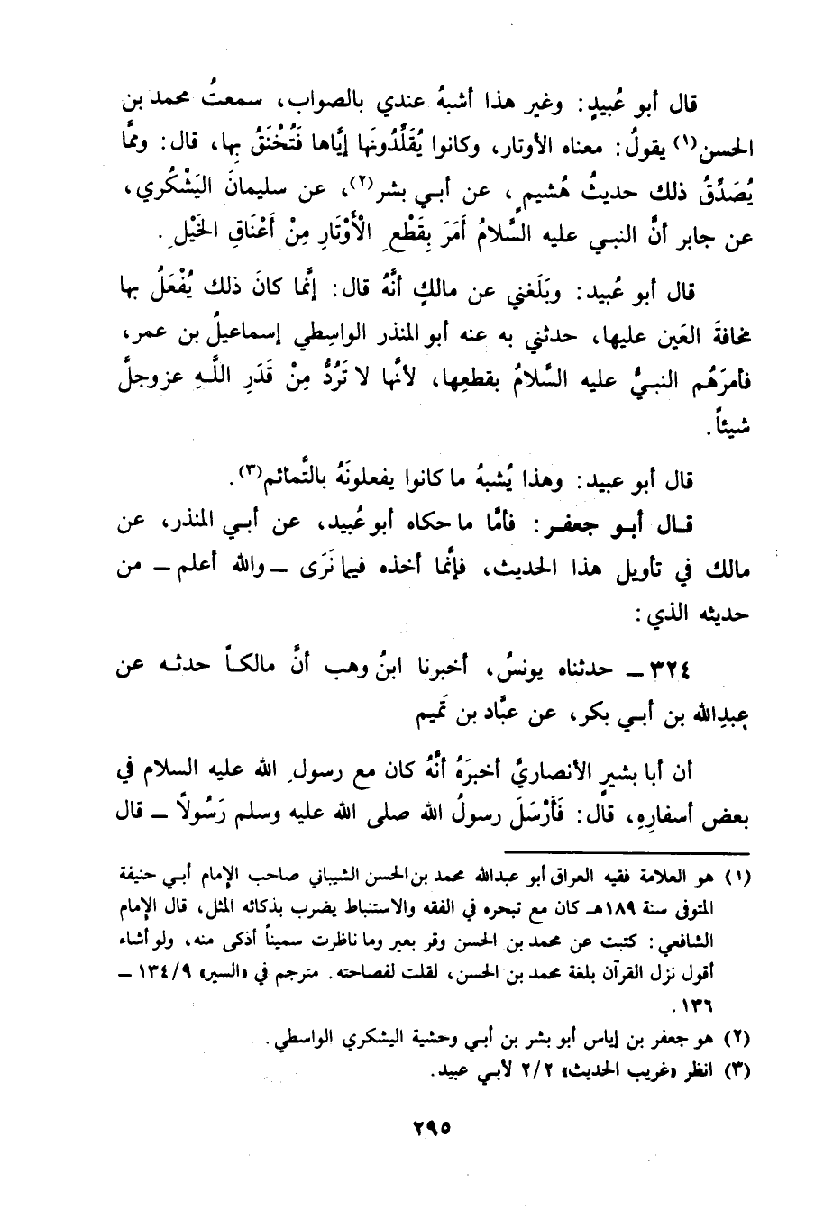 324 - حَدَّثَنَاهُ يُونُسُ، أَخْبَرَنَا ابْنُ وَهْبٍ، أَنَّ مَالِكًا حَدَّثَهُ , عَنْ عَبْدِ اللهِ بْنِ أَبِي بَكْرٍ، عَنْ عَبَّادِ بْنِ تَمِيمٍ، أَنَّ أَبَا بَشِيرٍ الْأَنْصَارِيَّ أَخْبَرَهُ أَنَّهُ كَانَ مَعَ رَسُولِ اللهِ عَلَيْهِ السَّلَامُ فِي بَعْضِ أَسْفَارِهِ قَالَ: فَأَرْسَلَ رَسُولُ اللهِ صَلَّى اللَّهُ عَلَيْهِ وَسَلَّمَ رَسُولًا، قَالَ -[296]- عَبْدُ اللهِ بْنُ أَبِي بَكْرٍ: حَسِبْتُ أَنَّهُ قَالَ: وَالنَّاسُ فِي مَبِيتِهِمْ: " أَلَا لَا تَبْقَيَنَّ فِي رَقَبَةِ بَعِيرٍ قِلَادَةٌ وَلَا وَتَرٌ إلَّا قُطِعَتْ " قَالَ مَالِكٌ: أَرَى ذَلِكَ مِنَ الْعَيْنِ