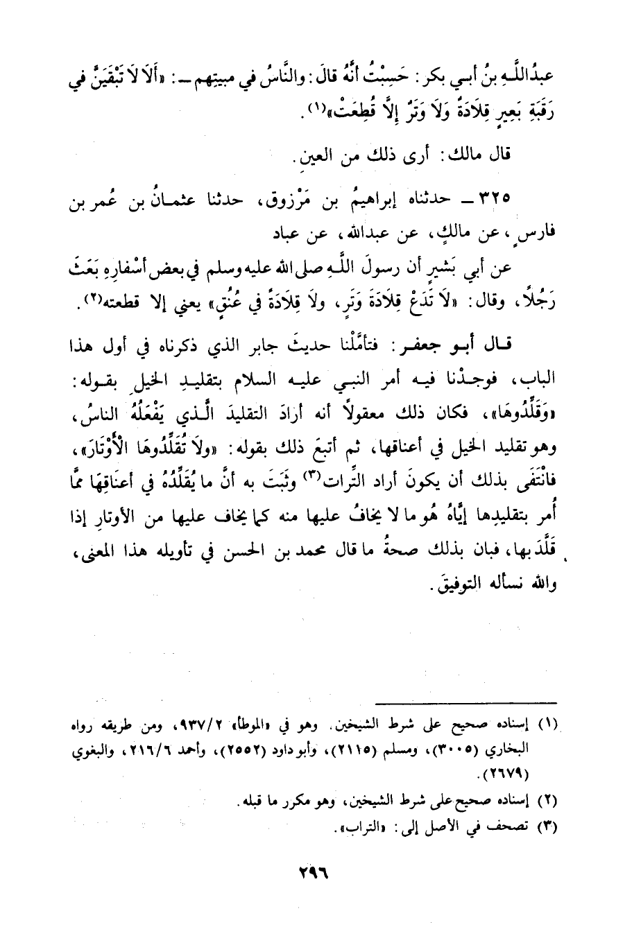 325 - حَدَّثَنَاهُ إبْرَاهِيمُ بْنُ مَرْزُوقٍ، حَدَّثَنَا عُثْمَانُ بْنُ عُمَرَ بْنِ فَارِسٍ، عَنْ مَالِكٍ، عَنْ عَبْدِ اللهِ، عَنْ عَبَّادٍ، عَنْ أَبِي بَشِيرٍ أَنَّ رَسُولَ اللهِ صَلَّى اللَّهُ عَلَيْهِ وَسَلَّمَ فِي بَعْضِ أَسْفَارِهِ بَعَثَ رَجُلًا، وَقَالَ: " لَا تَدَعْ قِلَادَةَ وَتَرٍ وَلَا قِلَادَةً فِي عُنُقٍ " يَعْنِي إلَّا قَطَعْتَهُ قَالَ أَبُو جَعْفَرٍ: فَتَأَمَّلْنَا حَدِيثَ جَابِرٍ الَّذِي ذَكَرْنَاهُ فِي أَوَّلِ هَذَا الْبَابِ فَوَجَدْنَا فِيهِ أَمْرَ النَّبِيِّ عَلَيْهِ السَّلَامُ بِتَقْلِيدِ الْخَيْلِ بِقَوْلِهِ: " وَقَلِّدُوهَا " فَكَانَ ذَلِكَ مَعْقُولًا أَنَّهُ أَرَادَ التَّقْلِيدَ الَّذِي يَفْعَلُهُ النَّاسُ , وَهُوَ تَقْلِيدُ الْخَيْلِ فِي أَعْنَاقِهَا , ثُمَّ أَتْبَعَ ذَلِكَ بِقَوْلِهِ: " وَلَا تُقَلِّدُوهَا الْأَوْتَارَ " فَانْتَفَى بِذَلِكَ أَنْ يَكُونَ أَرَادَ التِّرَاتَ وَثَبَتَ بِهِ أَنَّ مَا يُقَلِّدُهُ فِي أَعْنَاقِهَا مِمَّا أُمِرَ بِتَقْلِيدِهَا إيَّاهُ هُوَ مَا لَا يُخَافُ عَلَيْهَا مِنْهُ كَمَا يُخَافُ عَلَيْهَا مِنَ الْأَوْتَارِ إذَا قُلِّدَ بِهَا فَبَانَ بِذَلِكَ صِحَّةُ مَا قَالَ مُحَمَّدُ بْنُ الْحَسَنِ فِي تَأْوِيلِهِ هَذَا الْمَعْنَى وَاللهَ نَسْأَلُهُ التَّوْفِيقَ