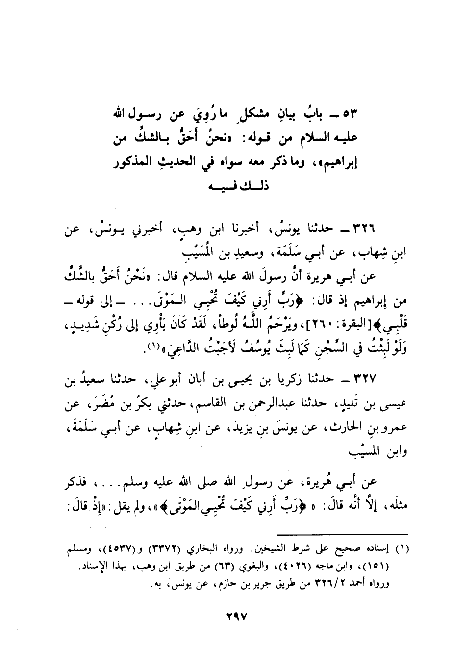 327 - حَدَّثَنَا زَكَرِيَّا بْنُ يَحْيَى بْنِ أَبَانَ أَبُو عَلِيٍّ، حَدَّثَنَا سَعِيدُ بْنُ عِيسَى بْنِ تَلِيدٍ، حَدَّثَنَا عَبْدُ الرَّحْمَنِ بْنُ الْقَاسِمِ، حَدَّثَنِي بَكْرُ بْنُ مُضَرَ، عَنْ عَمْرِو بْنِ الْحَارِثِ، عَنْ يُونُسَ بْنِ يَزِيدَ، عَنِ ابْنِ شِهَابٍ، عَنْ أَبِي سَلَمَةَ، وَابْنِ الْمُسَيِّبِ، عَنْ أَبِي هُرَيْرَةَ، عَنْ رَسُولِ اللهِ صَلَّى اللَّهُ عَلَيْهِ وَسَلَّمَ فَذَكَرَ مِثْلَهُ. إلَّا أَنَّهُ قَالَ: {رَبِّ أَرِنِي كَيْفَ تُحْيِي الْمَوْتَى} [البقرة: 260] وَلَمْ يَقُلْ: إذْ قَالَ -[298]-: {رَبِّ أَرِنِي كَيْفَ تُحْيِي الْمَوْتَى} [البقرة: 260] .