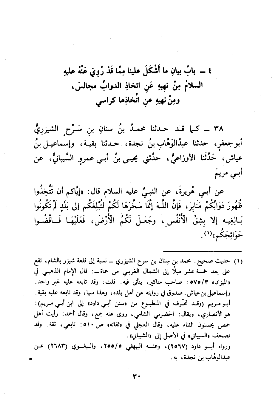 38 - كَمَا قَدْ حَدَّثَنَا مُحَمَّدُ بْنُ سِنَانِ بْنِ سَرْحٍ الشَّيْزَرِيُّ أَبُو جَعْفَرٍ، حَدَّثَنَا عَبْدُ الْوَهَّابِ بْنُ نَجْدَةَ، حَدَّثَنَا بَقِيَّةُ، وَإِسْمَاعِيلُ بْنُ عَيَّاشٍ , حَدَّثَنَا الْأَوْزَاعِيُّ، حَدَّثَنِي يَحْيَى بْنُ أَبِي عَمْرٍو السَّيْبَانِيُّ، عَنْ أَبِي مَرْيَمَ، عَنْ أَبِي هُرَيْرَةَ، عَنِ النَّبِيِّ عَلَيْهِ السَّلَامُ قَالَ: " إيَّاكُمْ أَنْ تَتَّخِذُوا ظُهُورَ دَوَابِّكُمْ مَنَابِرَ , فَإِنَّ اللهَ إنَّمَا سَخَّرَهَا لَكُمْ لِتُبَلِّغَكُمْ إلَى بَلَدٍ لَمْ تَكُونُوا بَالِغِيهِ إلَّا بِشِقِّ الْأَنْفُسِ , وَجَعَلَ لَكُمُ الْأَرْضَ , فَعَلَيْهَا فَاقْضُوا حَوَائِجَكُمْ " -[31]-
