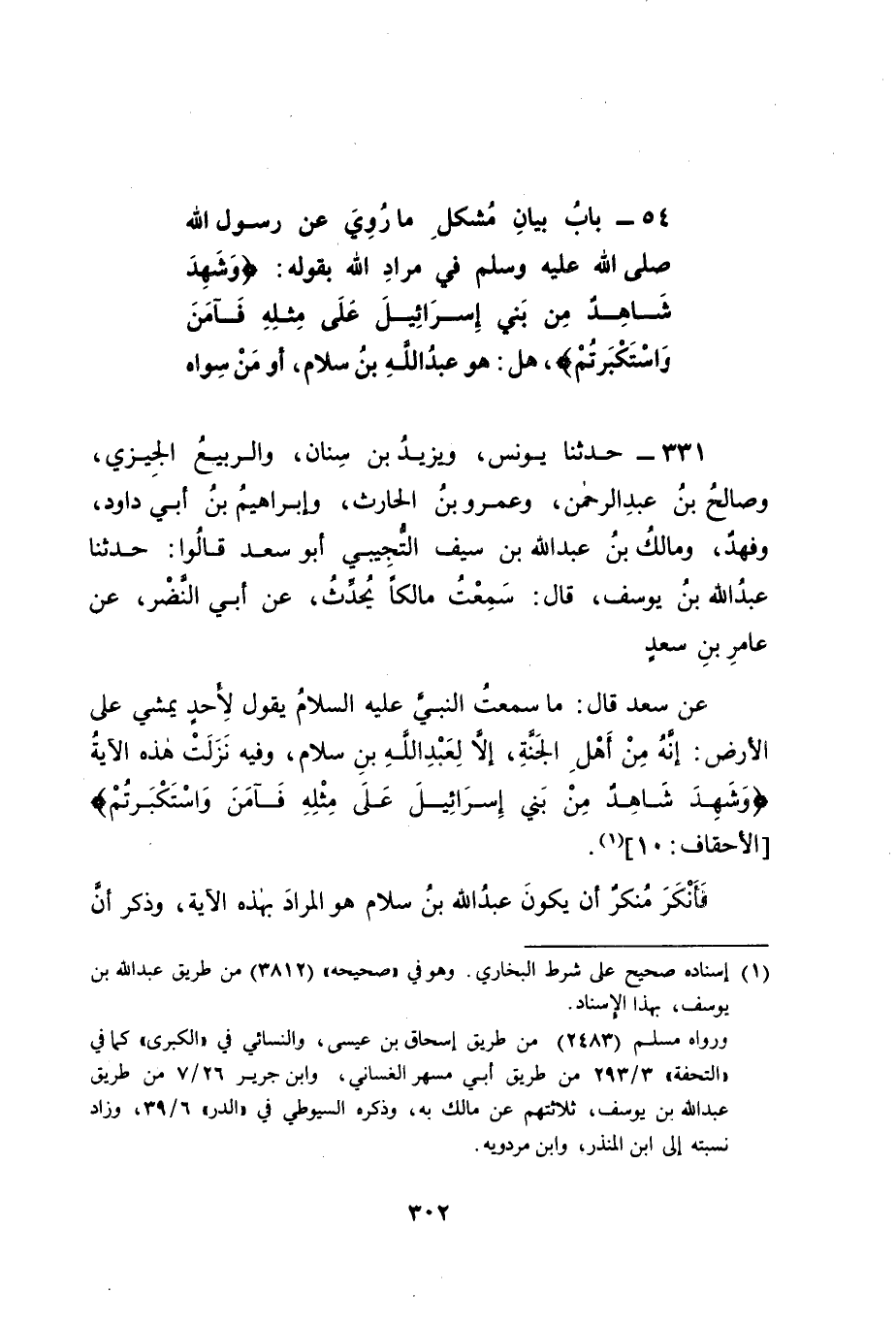 بَابُ بَيَانِ مُشْكِلِ مَا رُوِيَ عَنْ رَسُولِ اللهِ صَلَّى اللَّهُ عَلَيْهِ وَسَلَّمَ فِي مُرَادِ اللهِ بِقَوْلِهِ: {وَشَهِدَ شَاهِدٌ مِنْ بَنِي إسْرَائِيلَ عَلَى مِثْلِهِ فَآمَنَ وَاسْتَكْبَرْتُمْ} [الأحقاف: 10] هَلْ هُوَ عَبْدُ اللهِ بْنُ سَلَامٍ أَوْ مَنْ سِوَاهُ