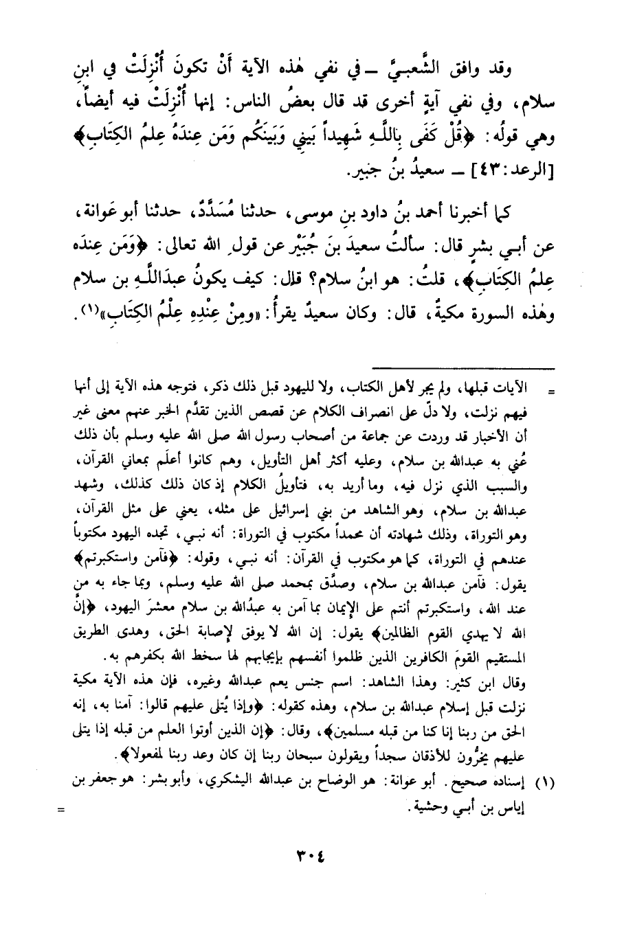 كَمَا أَخْبَرَنَا أَحْمَدُ بْنُ دَاوُدَ بْنِ مُوسَى , حَدَّثَنَا مُسَدَّدٌ , حَدَّثَنَا أَبُو عَوَانَةَ , عَنْ أَبِي بِشْرٍ قَالَ: سَأَلْتُ سَعِيدَ بْنَ جُبَيْرٍ عَنْ قَوْلِ اللهِ تَعَالَى: {وَمَنْ عِنْدَهُ عِلْمُ الْكِتَابِ} [الرعد: 43] قُلْتُ: هُوَ ابْنُ سَلَامٍ قَالَ: " كَيْفَ يَكُونُ عَبْدَ اللهِ بْنَ سَلَامٍ وَهَذِهِ السُّورَةُ مَكِّيَّةٌ " قَالَ: وَكَانَ سَعِيدٌ يَقْرَأُ: " وَمِنْ عِنْدِهِ عِلْمُ الْكِتَابِ " -[305]- وَكَانُوا يَشُدُّونَ ذَلِكَ بِمَا يَرْوِيهِ عَنِ ابْنِ عَبَّاسٍ