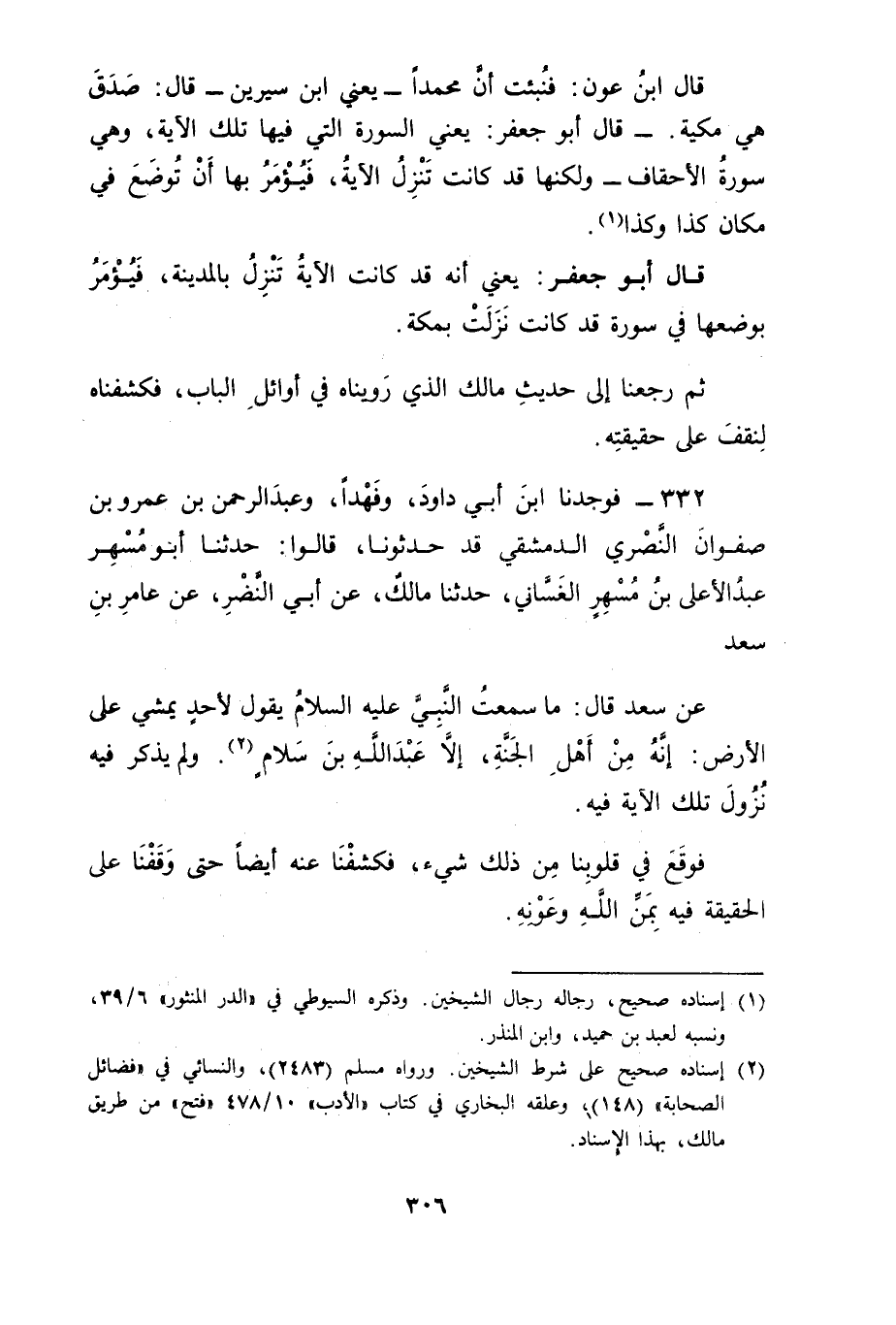 332 - فَوَجَدْنَا ابْنَ أَبِي دَاوُدَ , وَفَهْدًا , وَعَبْدَ الرَّحْمَنِ بْنَ عَمْرِو بْنِ صَفْوَانَ النَّصْرِيَّ الدِّمَشْقِيَّ قَدْ حَدَّثُونَا قَالُوا: حَدَّثَنَا أَبُو مُسْهِرٍ عَبْدُ الْأَعْلَى بْنُ مُسْهِرٍ الْغَسَّانِيُّ، حَدَّثَنَا مَالِكٌ، عَنْ أَبِي النَّضْرِ، عَنْ عَامِرِ بْنِ سَعْدٍ، عَنْ سَعْدٍ، قَالَ: " مَا سَمِعْتُ النَّبِيَّ عَلَيْهِ السَّلَامُ يَقُولُ لِأَحَدٍ يَمْشِي عَلَى الْأَرْضِ: إنَّهُ مِنْ أَهْلِ الْجَنَّةِ إلَّا عَبْدَ اللهِ بْنَ سَلَامٍ " وَلَمْ يُذْكَرْ فِيهِ نُزُولُ تِلْكَ الْآيَةِ فِيهِ فَوَقَعَ فِي قُلُوبِنَا مِنْ ذَلِكَ شَيْءٌ فَكَشَفْنَا عَنْهُ أَيْضًا حَتَّى وَقَفْنَا عَلَى الْحَقِيقَةِ فِيهِ بِمَنِّ اللهِ وَعَوْنِهِ -[307]-