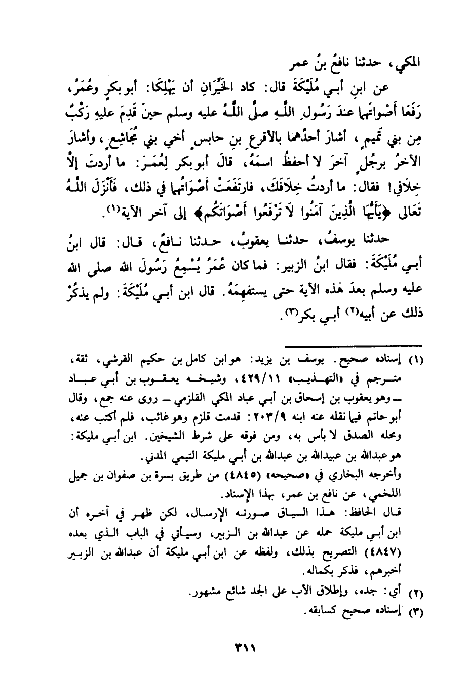 حَدَّثَنَا يُوسُفُ , حَدَّثَنَا يَعْقُوبُ , حَدَّثَنَا نَافِعٌ قَالَ: قَالَ ابْنُ أَبِي مُلَيْكَةَ: فَقَالَ ابْنُ الزُّبَيْرِ: " فَمَا كَانَ عُمَرُ يُسْمِعُ رَسُولَ اللهِ صَلَّى اللَّهُ عَلَيْهِ وَسَلَّمَ بَعْدَ هَذِهِ الْآيَةِ حَتَّى يَسْتَفْهِمَهُ " قَالَ ابْنُ أَبِي مُلَيْكَةَ: وَلَمْ يَذْكُرْ ذَلِكَ عَنْ أَبِيهِ أَبِي بَكْرٍ -[312]- قَالَ أَبُو جَعْفَرٍ: فَفِي هَذَا الْحَدِيثِ أَنَّ الْآيَةَ الَّتِي أُنْزِلَتْ فِي الْمَعْنَى الَّذِي كَانَ مِنْ أَبِي بَكْرٍ وَعُمَرَ الْمَذْكُورِ فِي هَذَا الْحَدِيثِ هِيَ: {لَا تَرْفَعُوا أَصْوَاتَكُمْ فَوْقَ صَوْتِ النَّبِيِّ وَلَا تَجْهَرُوا لَهُ بِالْقَوْلِ} [الحجرات: 2] وَقَدْ رُوِيَ أَنَّ الْآيَةَ الَّتِي أُنْزِلَتْ فِي ذَلِكَ هِيَ قَوْلُهُ: {يَا أَيُّهَا الَّذِينَ آمَنُوا لَا تُقَدِّمُوا بَيْنَ يَدَيِ اللهِ وَرَسُولِهِ} [الحجرات: 1] الْآيَةَ