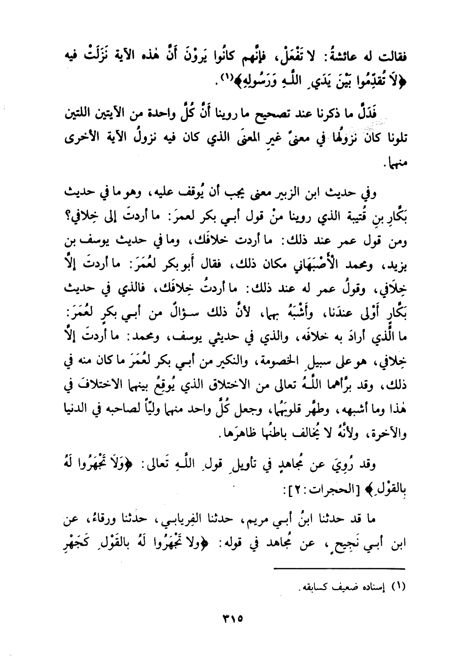 مَا قَدْ حَدَّثَنَا ابْنُ أَبِي مَرْيَمَ , حَدَّثَنَا الْفِرْيَابِيُّ , حَدَّثَنَا وَرْقَاءُ , عَنِ ابْنِ أَبِي نَجِيحٍ , عَنْ مُجَاهِدٍ فِي قَوْلِهِ تَعَالَى: {وَلَا تَجْهَرُوا لَهُ بِالْقَوْلِ كَجَهْرِ -[316]- بَعْضِكُمْ لِبَعْضٍ} [الحجرات: 2] قَالَ: " لَا تُنَادُوا نِدَاءً لَا تَقُولُوا: يَا مُحَمَّدُ , وَلَكِنْ قُولُوا قَوْلًا لَيِّنًا: يَا رَسُولَ اللهِ " وَرُوِيَ عَنْهُ أَيْضًا فِي تَأْوِيلِ قَوْلِهِ تَعَالَى: {لَا تُقَدِّمُوا بَيْنَ يَدَيِ اللهِ وَرَسُولِهِ} [الحجرات: 1]