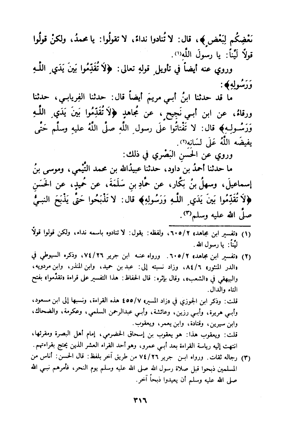 مَا قَدْ حَدَّثَنَا ابْنُ أَبِي مَرْيَمَ أَيْضًا قَالَ: حَدَّثَنَا الْفِرْيَابِيُّ , حَدَّثَنَا وَرْقَاءُ , عَنِ ابْنِ أَبِي نَجِيحٍ , عَنْ مُجَاهِدٍ: {لَا تُقَدِّمُوا بَيْنَ يَدَيِ اللهِ وَرَسُولِهِ} [الحجرات: 1] قَالَ: " لَا تَفْتَاتُوا عَلَى رَسُولِ اللهِ صَلَّى اللَّهُ عَلَيْهِ وَسَلَّمَ حَتَّى يُفِيضَهُ اللهُ عَلَى لِسَانِهِ " وَرُوِيَ عَنِ الْحَسَنِ الْبَصْرِيِّ فِي ذَلِكَ