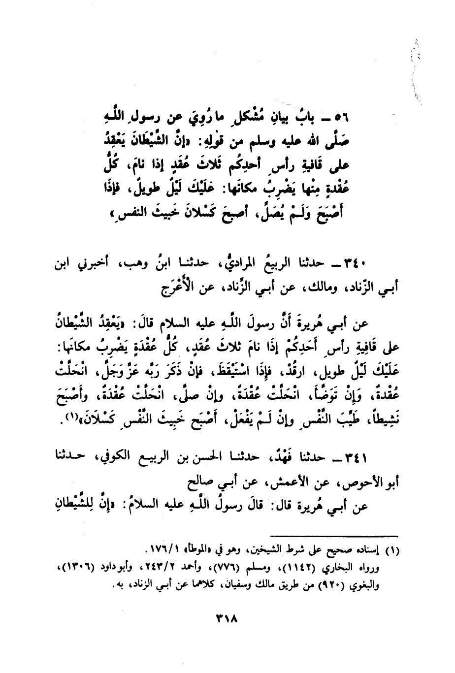 340 - حَدَّثَنَا الرَّبِيعُ الْمُرَادِيُّ، حَدَّثَنَا ابْنُ وَهْبٍ، أَخْبَرَنِي ابْنُ أَبِي الزِّنَادِ، وَمَالِكٌ، عَنْ أَبِي الزِّنَادِ، عَنِ الْأَعْرَجِ، عَنْ أَبِي هُرَيْرَةَ أَنَّ رَسُولَ اللهِ عَلَيْهِ السَّلَامُ قَالَ: " يَعْقِدُ الشَّيْطَانُ عَلَى قَافِيَةِ رَأْسِ أَحَدِكُمْ إذَا نَامَ ثَلَاثَ عُقَدٍ كُلُّ عُقْدَةٍ يَضْرِبُ مَكَانَهَا عَلَيْكَ لَيْلٌ طَوِيلٌ ارْقُدْ , فَإِذَا اسْتَيْقَظَ فَإِنْ ذَكَرَ رَبَّهُ عَزَّ وَجَلَّ انْحَلَّتْ عُقْدَةٌ , وَإِنْ تَوَضَّأَ انْحَلَّتْ عُقْدَةٌ , وَإِنْ صَلَّى انْحَلَّتْ عُقْدَةٌ وَأَصْبَحَ نَشِيطًا طَيِّبَ النَّفْسِ وَإِنْ لَمْ يَفْعَلْ أَصْبَحَ خَبِيثَ النَّفْسِ كَسْلَانَ "