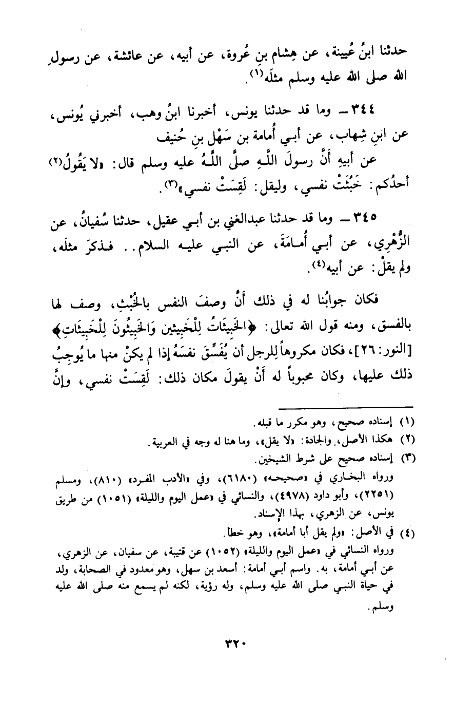 344 - وَمَا قَدْ حَدَّثَنَا يُونُسُ، أَخْبَرَنَا ابْنُ وَهْبٍ، أَخْبَرَنِي يُونُسُ، عَنِ ابْنِ شِهَابٍ، عَنْ أَبِي أُمَامَةَ بْنِ سَهْلِ بْنِ حُنَيْفٍ، عَنْ أَبِيهِ، أَنَّ رَسُولَ اللهِ صَلَّى اللَّهُ عَلَيْهِ وَسَلَّمَ قَالَ: " لَا يَقُولُ أَحَدُكُمْ: خَبُثَتْ نَفْسِي وَلْيَقُلْ: لَقِسَتْ نَفْسِي "