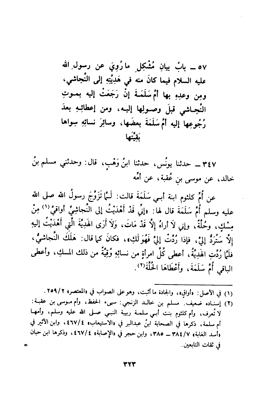 347 - حَدَّثَنَا يُونُسُ، حَدَّثَنَا ابْنُ وَهْبٍ، قَالَ: وَحَدَّثَنِي مُسْلِمُ بْنُ خَالِدٍ، عَنْ مُوسَى بْنِ عُقْبَةَ، عَنْ أُمِّهِ، عَنْ أُمِّ كُلْثُومٍ ابْنَةِ أَبِي سَلَمَةَ، قَالَتْ: لَمَّا تَزَوَّجَ رَسُولُ اللهِ صَلَّى اللَّهُ عَلَيْهِ وَسَلَّمَ أُمَّ سَلَمَةَ قَالَ لَهَا: " إنِّي قَدْ أَهْدَيْتُ إلَى النَّجَاشِيِّ أَوَاقِيَّ مِنْ مِسْكٍ وَحُلَّةً وَإِنِّي لَا أَرَاهُ إلَّا قَدْ مَاتَ وَلَا أَرَى الْهَدِيَّةَ الَّتِي أَهْدَيْتُ إلَيْهِ إلَّا سَتُرَدُّ إلَيَّ فَإِذَا رُدَّتْ إلَيَّ فَهُوَ لَكِ ". فَكَانَ كَمَا قَالَ هَلَكَ النَّجَاشِيُّ فَلَمَّا رُدَّتِ الْهَدِيَّةُ أَعْطَى كُلَّ امْرَأَةٍ مِنْ نِسَائِهِ وُقِيَّةً مِنْ ذَلِكَ الْمِسْكِ وَأَعْطَى الْبَاقِيَ أُمَّ سَلَمَةَ وَأَعْطَاهَا الْحُلَّةَ -[324]-