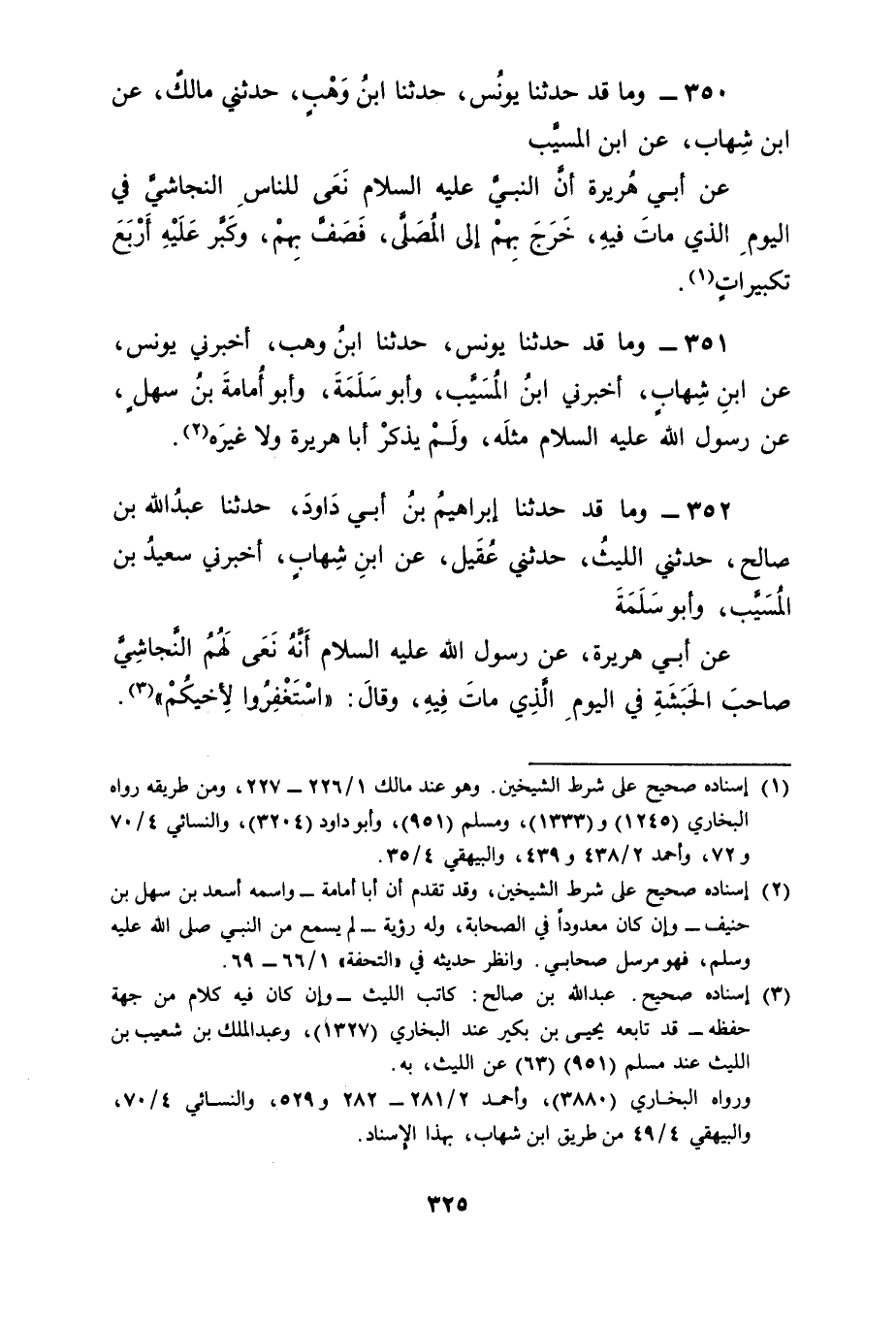 350 - وَمَا قَدْ حَدَّثَنَا يُونُسُ، حَدَّثَنَا ابْنُ وَهْبٍ، حَدَّثَنِي مَالِكٌ، عَنِ ابْنِ شِهَابٍ، عَنِ ابْنِ الْمُسَيِّبِ، عَنْ أَبِي هُرَيْرَةَ، " أَنَّ النَّبِيَّ عَلَيْهِ السَّلَامُ نَعَى لِلنَّاسِ النَّجَاشِيَّ فِي الْيَوْمِ الَّذِي مَاتَ فِيهِ خَرَجَ بِهِمْ إلَى الْمُصَلَّى فَصَفَّ بِهِمْ وَكَبَّرَ عَلَيْهِ أَرْبَعَ تَكْبِيرَاتٍ "