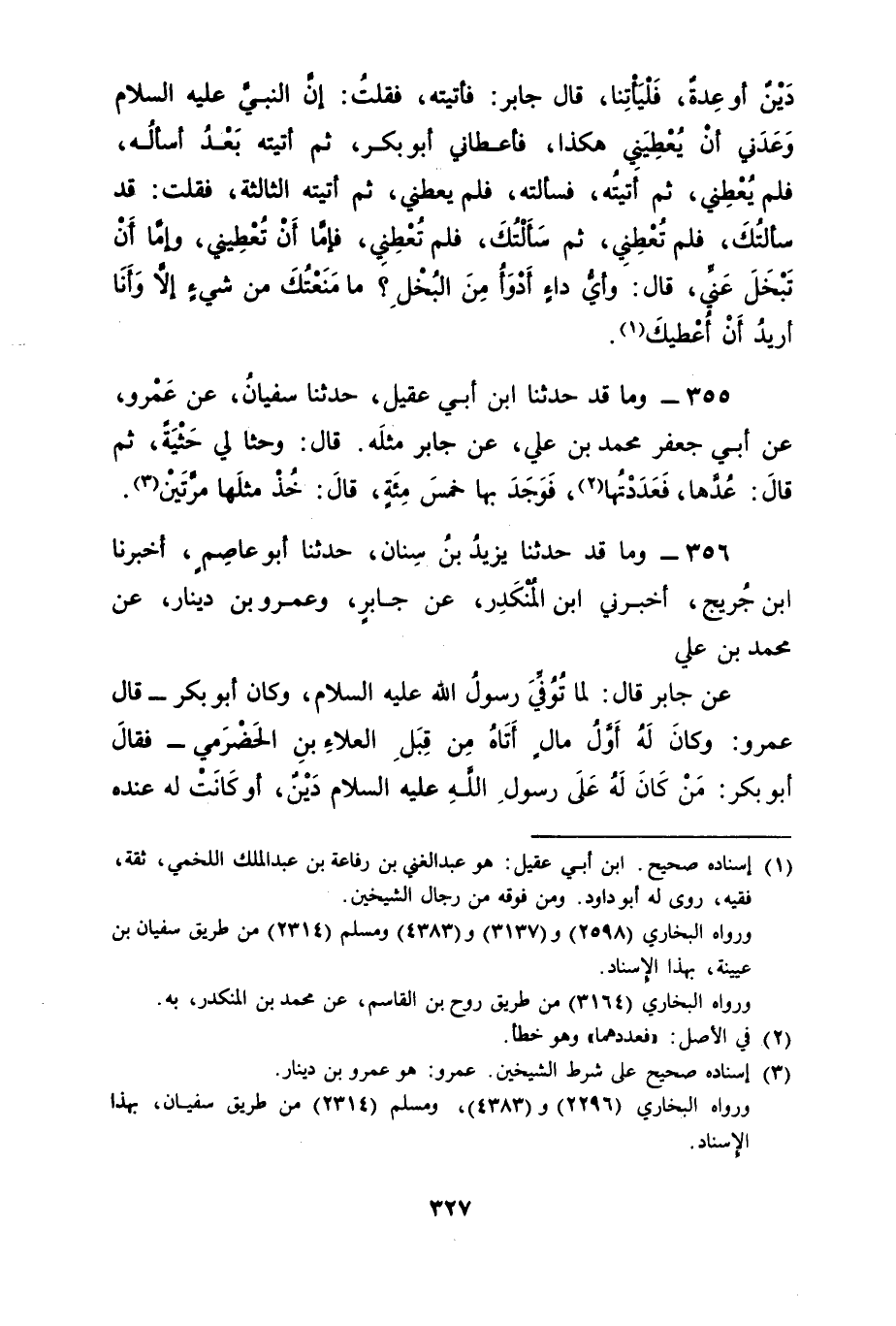 356 - وَمَا قَدْ حَدَّثَنَا يَزِيدُ بْنُ سِنَانٍ، حَدَّثَنَا أَبُو عَاصِمٍ، أَخْبَرَنَا ابْنُ جُرَيْجٍ، أَخْبَرَنِي ابْنُ الْمُنْكَدِرِ، عَنْ جَابِرٍ، وَعَمْرُو بْنُ دِينَارٍ، عَنْ مُحَمَّدِ بْنِ عَلِيٍّ، عَنْ جَابِرٍ، قَالَ: " لَمَّا تُوُفِّيَ رَسُولُ اللهِ عَلَيْهِ السَّلَامُ وَكَانَ أَبُو بَكْرٍ قَالَ عَمْرٌو وَكَانَ لَهُ أَوَّلُ مَالٍ أَتَاهُ مِنْ قِبَلِ الْعَلَاءِ بْنِ الْحَضْرَمِيِّ " فَقَالَ أَبُو بَكْرٍ: مَنْ كَانَ لَهُ عَلَى رَسُولِ اللهِ عَلَيْهِ السَّلَامُ دَيْنٌ أَوْ كَانَتْ لَهُ عِنْدَهُ -[328]- عِدَةٌ فَلْيَأْتِنَا قَالَ جَابِرٌ: فَقُلْتُ: " أَنَا وَعَدَنِي رَسُولُ اللهِ صَلَّى اللَّهُ عَلَيْهِ وَسَلَّمَ هَكَذَا وَهَكَذَا وَهَكَذَا ثَلَاثَ مَرَّاتٍ " وَبَسَطَ جَابِرٌ كَفَّيْهِ " فَعَدَّ لِي أَبُو بَكْرٍ خَمْسَ مِائَةٍ وَخَمْسَ مِائَةٍ وَخَمْسَ مِائَةٍ " قَالَ هَذَا الْمُنْكِرُ وَإِذَا كَانَتْ مَوَاعِيدُ رَسُولِ اللهِ صَلَّى اللَّهُ عَلَيْهِ وَسَلَّمَ فِي حَيَاتِهِ وَاجِبًا عَلَى وَلِيِّ أَمْرِهِ بَعْدَ وَفَاتِهِ إمْضَاؤُهَا كَانَ هُوَ عَلَيْهِ السَّلَامُ بِذَلِكَ فِي حَيَاتِهِ أَوْلَى، فَكَانَ جَوَابَنَا لَهُ فِي ذَلِكَ أَنَّ الَّذِي ذَكَرَهُ مِنْ إخْبَارِ رَسُولِ اللهِ عَلَيْهِ السَّلَامُ النَّاسَ بِحَقِيقَةِ مَوْتِ النَّجَاشِيِّ فِي الْيَوْمِ الَّذِي كَانَ مَوْتُهُ فِيهِ كَمَا ذُكِرَ. غَيْرَ أَنَّهُ قَدْ يَجُوزُ أَنْ يَكُونَ قَبْلَ ذَلِكَ لَمَّا تَأَخَّرَ عَنْهُ أَمْرُ هَدِيَّتِهِ وَانْقَطَعَتْ عَنْهُ أَخْبَارُ النَّجَاشِيِّ فِيهَا وَقَعَ بِقَلْبِهِ عِنْدَ ذَلِكَ مَا يَقَعُ مِثْلُهُ فِي قُلُوبِ مَنْ سِوَاهُ مِنْ بَنِي آدَمَ فِيمَا قَدْ كَانَ مِمَّا قَدْ جَرَتِ الْعَادَةُ فِيهِ بِخِلَافِهِ مَا ذُكِرَ فِي الْحَدِيثِ الْأَوَّلِ الَّذِي قَدْ ذَكَرْنَاهُ فِي أَوَّلِ هَذَا الْبَابِ , ثُمَّ لَمَّا أَطْلَعَهُ اللهُ عَلَى حَقِيقَةِ مَوْتِ النَّجَاشِيِّ فِي الْيَوْمِ الَّذِي كَانَتْ وَفَاتُهُ فِيهِ كَانَ مِنْهُ مَا أَخْبَرَ النَّاسَ بِهِ مِمَّا ذُكِرَ فِي الْفَصْلِ الثَّانِي مِنْ هَذَا الْبَابِ وَأَمَّا مَا كَانَ مِنْهُ عَلَيْهِ السَّلَامُ فِي إعْطَائِهِ أُمَّ سَلَمَةَ بَعْضَ الْهَدِيَّةِ الَّتِي رُدَّتْ إلَيْهِ وَإِعْطَائِهِ بَقِيَّتَهَا مَنْ سِوَاهَا مِنْ أَزْوَاجِهِ بَعْدَ تَقَدُّمِ وَعْدِهِ إيَّاهَا بِهَا كُلِّهَا , فَإِنَّ ذَلِكَ مِمَّا قَدْ يَجُوزُ أَنْ تَكُونَ الْهَدِيَّةُ لَمَّا رُدَّتْ إلَيْهِ بَذَلَهَا لِأُمَّ سَلَمَةَ كَمَا كَانَ وَعَدَهَا بِهَا ثُمَّ لَمْ تَقْبَلْهَا إلَّا بِإِدْخَالِهِ بَقِيَّةَ نِسَائِهِ مَعَهَا فِيهَا كَرَاهِيَةَ اسْتِئْثَارِهَا عَلَيْهِنَّ كَمَا كَانَ مِنَ الْأَنْصَارِ لَمَّا دَعَاهُمْ لِيَقْطَعَ لَهُمْ مِنَ الْبَحْرَيْنِ مَا أَرَادَ أَنْ يَقْطَعَهُ لَهُمْ مِنْ ذَلِكَ فَقَالُوا: لَا نَفْعَلُ حَتَّى تَقْطَعَ لِإِخْوَانِنَا مِنَ الْمُهَاجِرِينَ مِثْلَ الَّذِي قَطَعْتَهُ لَنَا مِنْ ذَلِكَ -[329]- كَرَاهِيَةَ الِاسْتِئْثَارِ عَلَيْهِمْ مِمَّا قَالَهُ رَسُولُ اللهِ عَلَيْهِ السَّلَامُ لَهُمْ وَسَنَذْكُرُ ذَلِكَ بِإِسْنَادِهِ فِيمَا هُوَ أَوْلَى بِذَلِكَ بِهِ مِنْ هَذَا الْمَوْضِعِ مِنْ كِتَابِنَا هَذَا إنْ شَاءَ اللهُ فَكَانَ مَا فَعَلَهُ رَسُولُ اللهِ صَلَّى اللَّهُ عَلَيْهِ وَسَلَّمَ فِي أَمْرِ أُمِّ سَلَمَةَ يَحْتَمِلُ أَنْ يَكُونَ عَلَى هَذَا الْمَعْنَى، وَفِي ذَلِكَ مَا قَدْ أَوْجَبَ لَهَا جَلَالَةَ الرُّتْبَةِ وَحُسْنَ الصُّحْبَةِ لِصَوَاحِبَاتِهَا مِنْ أَزْوَاجِ النَّبِيِّ عَلَيْهِ السَّلَامُ
