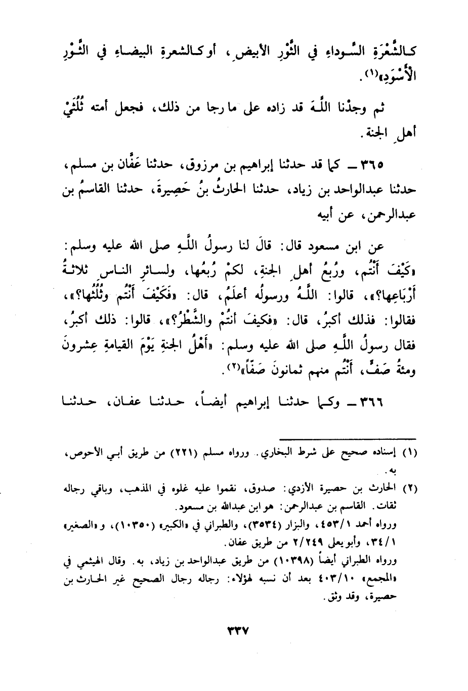 365 - كَمَا قَدْ حَدَّثَنَا إبْرَاهِيمُ بْنُ مَرْزُوقٍ، حَدَّثَنَا عَفَّانُ بْنُ مُسْلِمٍ، حَدَّثَنَا عَبْدُ الْوَاحِدِ بْنُ زِيَادٍ، حَدَّثَنَا الْحَارِثُ بْنُ حَصِيرَةَ، حَدَّثَنَا الْقَاسِمُ بْنُ عَبْدِ الرَّحْمَنِ، عَنْ أَبِيهِ، عَنِ ابْنِ مَسْعُودٍ، قَالَ: قَالَ لَنَا رَسُولُ اللهِ صَلَّى اللَّهُ عَلَيْهِ وَسَلَّمَ: " كَيْفَ أَنْتُمْ وَرُبُعَ أَهْلِ الْجَنَّةِ لَكُمْ رُبُعُهَا وَلِسَائِرِ النَّاسِ ثَلَاثَةُ أَرْبَاعِهَا؟ " قَالُوا: اللهُ وَرَسُولُهُ أَعْلَمُ. قَالَ: " فَكَيْفَ أَنْتُمْ وَثُلُثَهَا؟ " فَقَالُوا: فَذَلِكَ أَكْبَرُ , قَالَ: " فَكَيْفَ أَنْتُمْ وَالشَّطْرَ؟ " قَالُوا: ذَلِكَ أَكْبَرُ فَقَالَ رَسُولُ اللهِ صَلَّى اللَّهُ عَلَيْهِ وَسَلَّمَ: " أَهْلُ الْجَنَّةِ يَوْمَ الْقِيَامَةِ عِشْرُونَ وَمِائَةُ صَفٍّ أَنْتُمْ مِنْهُمْ ثَمَانُونَ صَفًّا "