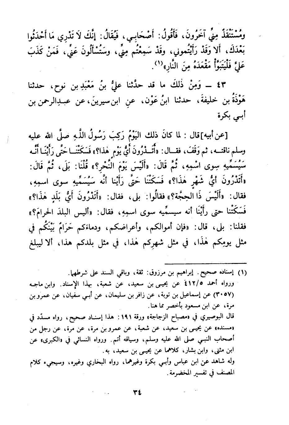 43 - وَمِنْ ذَلِكَ مَا قَدْ حَدَّثَنَا عَلِيُّ بْنُ مَعْبَدِ بْنِ نُوحٍ، حَدَّثَنَا هَوْذَةُ بْنُ خَلِيفَةَ، حَدَّثَنَا ابْنُ عَوْنٍ، عَنِ ابْنِ سِيرِينَ، عَنْ عَبْدِ الرَّحْمَنِ بْنِ أَبِي بَكْرَةَ، عَنْ أَبِيهِ، قَالَ: لَمَّا كَانَ ذَلِكَ الْيَوْمُ رَكِبَ رَسُولُ اللهِ صَلَّى اللَّهُ عَلَيْهِ وَسَلَّمَ نَاقَتَهُ , ثُمَّ وَقَفَ , فَقَالَ: " أَتَدْرُونَ أَيَّ يَوْمٍ هَذَا؟ " فَسَكَتْنَا حَتَّى رَأَيْنَا أَنَّهُ سَيُسَمِّيهِ سِوَى اسْمِهِ , ثُمَّ قَالَ: " أَلَيْسَ يَوْمَ النَّحْرِ؟ " قُلْنَا: بَلَى , ثُمَّ قَالَ: " أَتَدْرُونَ أَيَّ شَهْرٍ هَذَا؟ " فَسَكَتْنَا حَتَّى رَأَيْنَا أَنَّهُ سَيُسَمِّيهِ سِوَى اسْمِهِ , فَقَالَ: " أَلَيْسَ ذَا الْحِجَّةِ؟ " فَقَالُوا: بَلَى , فَقَالَ: " أَتَدْرُونَ أَيَّ بَلَدٍ هَذَا؟ " فَسَكَتْنَا حَتَّى رَأَيْنَا أَنَّهُ سَيُسَمِّيهِ سِوَى اسْمِهِ , " فَقَالَ أَلَيْسَ الْبَلَدَ الْحَرَامَ؟ " فَقُلْنَا: بَلَى , قَالَ: " فَإِنَّ أَمْوَالَكُمْ , وَأَعْرَاضَكُمْ , وَدِمَاءَكُمْ حَرَامٌ بَيْنَكُمْ فِي مِثْلِ يَوْمِكُمْ هَذَا , فِي مِثْلِ شَهْرِكُمْ هَذَا , فِي مِثْلِ بَلَدِكُمْ هَذَا , أَلَا لِيُبَلِّغِ -[35]- الشَّاهِدُ الْغَائِبَ , فَرُبَّ مُبَلَّغٍ أَوْعَى مِنْ مُبَلِّغٍ , ثُمَّ مَالَ عَلَى نَاقَتِهِ إلَى غُنَيْمَاتٍ , فَجَعَلَ يُقَسِّمُهُنَّ بَيْنَ الرَّجُلَيْنِ الشَّاةُ , وَبَيْنَ الثَّلَاثَةِ الشَّاةُ " وَذَكَرَ حَدِيثَ أَبِي بَكْرَةَ , وَفِيهِ: رَكِبَ رَسُولُ اللهِ عَلَيْهِ السَّلَامُ نَاقَتَهُ. قَالَ أَبُو جَعْفَرٍ: فَكَانَ مَا كَانَ مِنْهُ مِنْ خُطْبَتِهِ عَلَى رَاحِلَتِهِ جُلُوسًا مِنْهُ عَلَيْهَا فِي ذَلِكَ , وَحَاشَ لِلَّهِ أَنْ يَكُونَ كَانَ مِنْهُ فِي فِعْلِهِ مَا يُضَادُّ مَا كَانَ مِنْهُ فِي قَوْلِهِ الَّذِي ذَكَرْنَاهُ مِنْهُ فِي الْحَدِيثَيْنِ اللَّذَيْنِ قَدَّمْنَا ذِكْرَهُمَا , وَلَكِنَّهُ كَانَ الَّذِي كَانَ مِنْهُ مِمَّا ذَكَرْنَا فِي ذَيْنِكَ الْحَدِيثَيْنِ عَلَى نَهْيِهِ عَنِ الْجُلُوسِ عَلَى ظُهُورِ الدَّوَابِّ , لِلْحَدِيثِ عَلَيْهَا الَّذِي لَا حَاجَةَ بِالْجَالِسِ عَلَيْهَا فِي ذَلِكَ مِنْهُ , وَإِذْ لَا فَضْلَ لِجُلُوسِهِ عَلَيْهَا لِذَلِكَ الْحَدِيثِ , وَجُلُوسُهُ عَلَى الْأَرْضِ , وَإِنْ كَانَ جُلُوسُهُ عَلَى ظَهْرِهَا لِذَلِكَ فَضْلًا لَمْ تَدْعُهُ إلَيْهِ ضَرُورَةٌ , وَفِي ذَلِكَ إتْعَابُهَا لِغَيْرِ ضَرُورَةٍ دَعَتْهُ إلَى ذَلِكَ مِنْهَا , وَكَانَ جُلُوسُهُ لِلْخُطْبَةِ عَلَى النَّاسِ عَلَيْهَا , وَلِإِسْمَاعِهِ إيَّاهُمْ أَمْرَهُ وَنَهْيَهُ مِمَّا لَا يَتَهَيَّأُ لَهُ مِثْلُهُ فِي الْجُلُوسِ عَلَى الْأَرْضِ , وَإِذَا كَانَ الْجُلُوسُ عَلَى الْأَرْضِ لَا يُسْمَعُ مِنْهُ مَا يَكُونُ مِنْ أَمْرِهِ وَنَهْيِهِ كَمَا يُسْمَعُ ذَلِكَ مِنْهُ , وَهُوَ عَلَى ظَهْرِ رَاحِلَتِهِ , وَكَانَتْ خُطْبَتُهُ عَلَى ظَهْرِهَا بِمَا ذَكَرْنَا مِمَّا قَدْ دَعَتْهُ إلَيْهِ ضَرُورَةٌ , وَكَانَ مَا فِي الْحَدِيثَيْنِ الْأَوَّلَيْنِ مِنْ نَهْيِهِ عَمَّا نَهَى عَنْهُ فِيهِمَا إنَّمَا هُوَ نَهْيٌ عَنْ جُلُوسٍ عَلَى ظَهْرِهَا مِمَّا لَمْ تَدْعُ إلَيْهِ ضَرُورَةٌ , فَخَرَجَ كُلُّ وَاحِدٍ مِمَّا فِي الْحَدِيثَيْنِ , وَمِمَّا فِي خُطْبَتِهِ عَلَى رَاحِلَتِهِ عَلَى مَعْنَى خِلَافِ -[36]- الْمَعْنَى الَّذِي خَرَجَ عَلَيْهِ مَعْنَى مَا فِي صَاحِبِهِ , وَانْتَفَى أَنْ يَكُونَ فِي ذَلِكَ تَضَادٌّ. قَالَ أَبُو جَعْفَرٍ: وَسَأَلَ سَائِلٌ عَنْ مُعَاذٍ الْمَذْكُورِ فِي أَحَدِ الْحَدِيثَيْنِ وَهُوَ مُعَاذُ بْنُ أَنَسٍ الْجُهَنِيُّ , فَقَالَ: هَلْ ثَبَتَ لَهُ عِنْدَكُمْ صُحْبَةٌ يَجِبُ بِهَا إدْخَالُ حَدِيثِهِ الَّذِي رَوَيْتُمُوهُ عَنْهُ فِي هَذَا الْبَابِ عَنْ رَسُولِ اللهِ صَلَّى الل