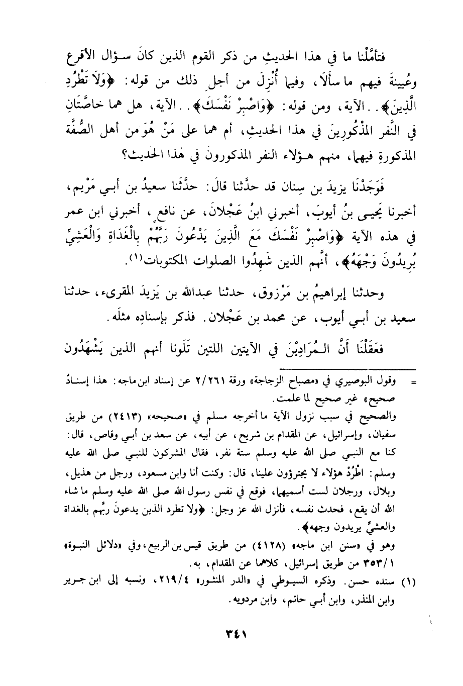 فَوَجَدْنَا يَزِيدَ بْنَ سِنَانٍ قَدْ حَدَّثَنَا قَالَ حَدَّثَنَا سَعِيدُ بْنُ أَبِي مَرْيَمَ أَخْبَرَنَا يَحْيَى بْنُ أَيُّوبَ أَخْبَرَنِي ابْنُ عَجْلَانَ عَنْ نَافِعٍ أَخْبَرَنِي ابْنُ عُمَرَ: فِي هَذِهِ الْآيَةِ {وَاصْبِرْ نَفْسَكَ مَعَ الَّذِينَ يَدْعُونَ رَبَّهُمْ بِالْغَدَاةِ وَالْعَشِيِّ يُرِيدُونَ وَجْهَهُ} [الكهف: 28] : " أَنَّهُمُ الَّذِينَ شَهِدُوا الصَّلَوَاتِ الْمَكْتُوبَاتِ " وَحَدَّثَنَا إبْرَاهِيمُ بْنُ مَرْزُوقٍ حَدَّثَنَا عَبْدُ اللهِ بْنُ يَزِيدَ الْمُقْرِئُ حَدَّثَنَا سَعِيدُ بْنُ أَبِي أَيُّوبَ عَنْ مُحَمَّدِ بْنِ عَجْلَانَ فَذَكَرَ بِإِسْنَادِهِ مِثْلَهُ. فَعَقَلْنَا أَنَّ الْمُرَادَيْنِ فِي الْآيَتَيْنِ اللَّتَيْنِ تَلَوْنَا أَنَّهُمُ الَّذِينَ يَشْهَدُونَ -[342]- الصَّلَوَاتِ الْمَكْتُوبَاتِ , وَأَنَّهُمَا لَيْسَتَا بِخَاصَّتَيْنِ لِلنَّفَرِ الْمَذْكُورِينَ فِي حَدِيثِ خَبَّابٍ دُونَ مَنْ سِوَاهُمْ مِنَ النَّاسِ , وَأَنَّهُمَا عَلَى النَّفَرِ الْمَوْصُوفِينَ فِي حَدِيثِ ابْنِ عُمَرَ , وَأَنَّ مِنْهُمُ النَّفَرَ الْمَذْكُورِينَ فِي حَدِيثِ خَبَّابٍ وَأَمْثَالَهُمْ مِمَّنْ كَانَ يَشْهَدُ مَا يَشْهَدُونَ مِنَ الصَّلَوَاتِ الْخَمْسِ