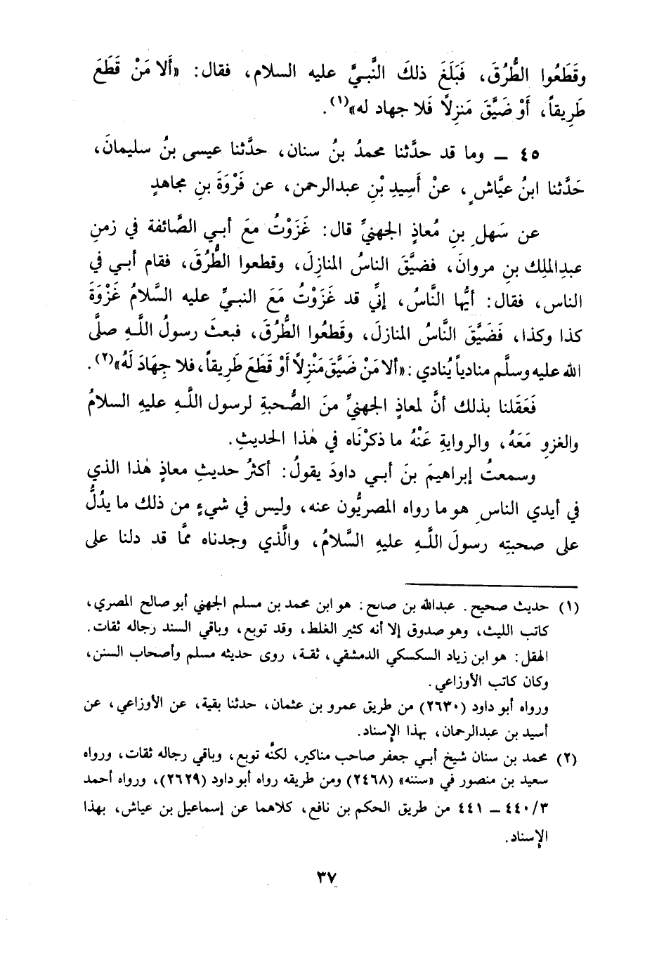 45 - وَمَا قَدْ حَدَّثَنَا مُحَمَّدُ بْنُ سِنَانٍ، حَدَّثَنَا عِيسَى بْنُ سُلَيْمَانَ، حَدَّثَنَا ابْنُ عَيَّاشٍ، عَنْ أُسَيْدَ بْنِ عَبْدِ الرَّحْمَنِ، عَنْ فَرْوَةَ بْنِ مُجَاهِدٍ، عَنْ سَهْلِ بْنِ مُعَاذٍ الْجُهَنِيِّ، قَالَ: غَزَوْتُ مَعَ أَبِي الصَّائِفَةَ فِي زَمَنِ عَبْدِ الْمَلِكِ بْنِ مَرْوَانَ , فَضَيَّقَ النَّاسُ الْمَنَازِلَ , وَقَطَعُوا الطُّرُقَ , فَقَامَ أَبِي فِي النَّاسِ , فَقَالَ: أَيُّهَا النَّاسُ , إنِّي قَدْ غَزَوْتُ مَعَ النَّبِيِّ عَلَيْهِ السَّلَامُ غَزْوَةَ كَذَا وَكَذَا , فَضَيَّقَ النَّاسُ الْمَنَازِلَ , وَقَطَعُوا الطُّرُقَ , فَبَعَثَ رَسُولُ اللهِ صَلَّى اللَّهُ عَلَيْهِ وَسَلَّمَ مُنَادِيًا يُنَادِي: " أَلَا مَنْ ضَيَّقَ مَنْزِلًا أَوْ قَطَعَ طَرِيقًا , فَلَا جِهَادَ لَهُ " فَعَقَلْنَا بِذَلِكَ أَنَّ لِمُعَاذٍ الْجُهَنِيِّ مِنَ الصُّحْبَةِ لِرَسُولِ اللهِ عَلَيْهِ السَّلَامُ وَالْغَزْوِ مَعَهُ , وَالرِّوَايَةِ عَنْهُ مَا ذَكَرْنَاهُ فِي هَذَا الْحَدِيثِ. وَسَمِعْتُ إبْرَاهِيمَ بْنَ أَبِي دَاوُدَ يَقُولُ: أَكْثَرُ حَدِيثِ مُعَاذٍ هَذَا الَّذِي فِي أَيْدِي النَّاسِ هُوَ مَا رَوَاهُ الْمِصْرِيُّونَ عَنْهُ , وَلَيْسَ فِي شَيْءٍ مِنْ ذَلِكَ مَا يَدُلُّ عَلَى صُحْبَتِهِ رَسُولَ اللهِ عَلَيْهِ السَّلَامُ , وَالَّذِي وَجَدْنَاهُ مِمَّا قَدْ دَلَّنَا عَلَى -[38]- ذَلِكَ , فَهُوَ مَا رَوَاهُ الشَّامِيُّونَ عَنْهُ عَلَى قِلَّةِ رِوَايَتِهِمْ عَنْهُ قَالَ أَبُو جَعْفَرٍ: قَالَ أَبُو عُبَيْدٍ فِيمَا أَجَازَهُ لَنَا عَلِيُّ بْنُ عَبْدِ الْعَزِيزِ عَنْهُ: الْمُخَضْرَمَةُ: الْمَشْقُوقَةُ الْأُذُنُ , وَأَنْكَرَ ذَلِكَ عَلَيْهِ غَيْرُهُ , مِنْهُمْ عَبَّاسٌ الرِّيَاشِيُّ فِيمَا حَدَّثَنِي إبْرَاهِيمُ بْنُ حُمَيْدٍ عَنْهُ , قَالَ: مُحَالٌ عِنْدَنَا أَنْ يَكُونَ النَّبِيُّ عَلَيْهِ السَّلَامُ خَطَبَ عَلَى نَاقَةٍ هَذِهِ صِفَتُهَا لِأَنَّهَا مَبْتُوكَةٌ , وَلَكِنَّهَا نَاقَةٌ وُلِدَتْ بَيْنَ الْعِرَابِ، وَالْيَمَانِيَّةِ , فَقِيلَ لَهَا بِذَلِكَ: مُخَضْرَمَةٌ كَمَا قِيلَ لِمَنْ وُلِدَ فِي الْجَاهِلِيَّةِ , وَلَحِقَ الْإِسْلَامَ مُخَضْرَمٌ , أَيْ: لِإِدْرَاكِهِ الطَّرَفَيْنِ جَمِيعًا. سَمِعْتُ مُحَمَّدَ بْنَ عَلِيِّ بْنِ دَاوُدَ الْبَغْدَادِيَّ يَقُولُ: سَمِعْتُ يَحْيَى بْنَ مَعِينٍ يَقُولُ لِأَحْمَدَ بْنِ حَنْبَلٍ عَلَى بَابِ عَفَّانَ: يَا أَبَا عَبْدِ اللهِ , إِنْ سَرَّكَ أَنْ تَكْتُبَ عَنْ رَجُلٍ لَا يَكُونُ فِي قَلْبِكَ مِنْهُ شَيْءٌ , فَاكْتُبْ عَنْ أَبِي غَسَّانَ مَالِكِ بْنِ إسْمَاعِيلَ