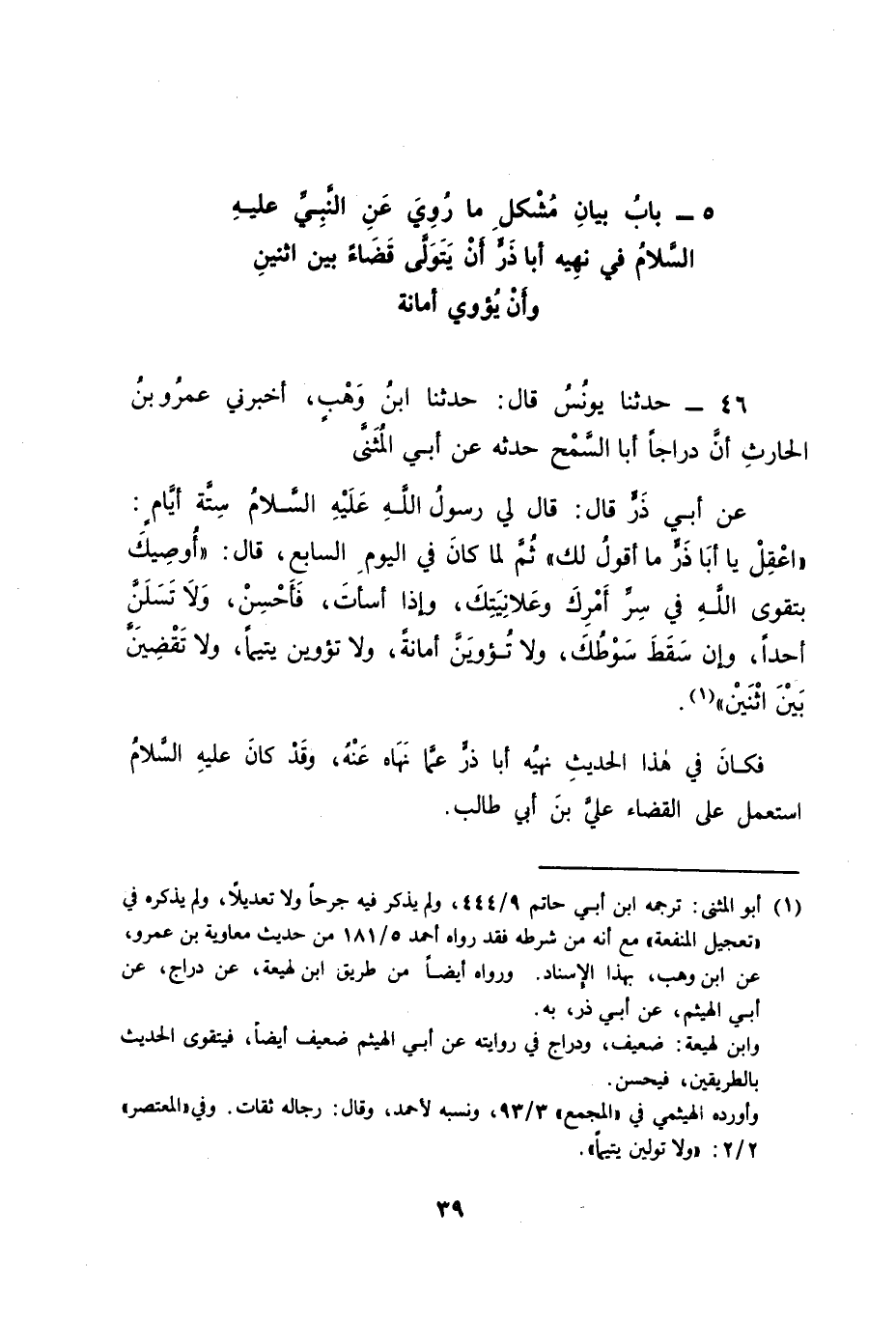 46 - حَدَّثَنَا يُونُسُ، قَالَ: حَدَّثَنَا ابْنُ وَهْبٍ، أَخْبَرَنِي عَمْرُو بْنُ الْحَارِثِ، أَنَّ دَرَّاجًا أَبَا السَّمْحِ حَدَّثَهُ , عَنْ أَبِي الْمُثَنَّى، عَنْ أَبِي ذَرٍّ، قَالَ: قَالَ لِي رَسُولُ اللهِ عَلَيْهِ السَّلَامُ سِتَّةَ أَيَّامٍ: " اعْقِلْ يَا أَبَا ذَرٍّ مَا أَقُولُ لَكَ " ثُمَّ لَمَّا كَانَ فِي الْيَوْمِ السَّابِعِ , قَالَ: " أُوصِيكَ بِتَقْوَى اللهِ فِي سِرِّ أَمْرِكَ وَعَلَانِيَتِكَ , وَإِذَا أَسَأْتَ فَأَحْسِنْ , وَلَا تَسَلْنَ أَحَدًا , وَإِنْ سَقَطَ سَوْطُكَ , وَلَا تُؤْوِيَنَّ أَمَانَةً , وَلَا تُؤْوِيَنَّ يَتِيمًا , وَلَا تَقْضِيَنَّ بَيْنَ اثْنَيْنِ " فَكَانَ فِي هَذَا الْحَدِيثِ نَهْيُهُ أَبَا ذَرٍّ عَمَّا نَهَاهُ عَنْهُ , وَقَدْ كَانَ عَلَيْهِ السَّلَامُ اسْتَعْمَلَ عَلَى الْقَضَاءِ عَلِيَّ بْنَ أَبِي طَالِبٍ، -[40]- فَعَقَلْنَا بِذَلِكَ أَنَّهُ لَمْ يَسْتَعْمِلْهُ عَلَى عَمَلٍ مَكْرُوهٍ , وَأَنَّهُ لَمْ يُدْخِلْهُ فِي مَعْنًى يُنْقِصُ بِهِ رُتْبَتَهُ عَمَّا هِيَ عَلَيْهِ , بَلْ مَا أَدْخَلَهُ إلَّا فِي مَعْنًى يَكُونُ زَائِدًا فِي رُتْبَتِهِ , وَفِي مَعْنًى يَكُونُ سَبَبًا لِمَا يُقَرِّبُهُ مِنْ رَبِّهِ تَعَالَى. وَرُوِيَ مِمَّا كَانَ مِنْهُ إلَى عَلِيٍّ فِي ذَلِكَ لَمَّا بَعَثَهُ عَلَى مَا وَلَّاهُ عَلَيْهِ , مِنْهُ