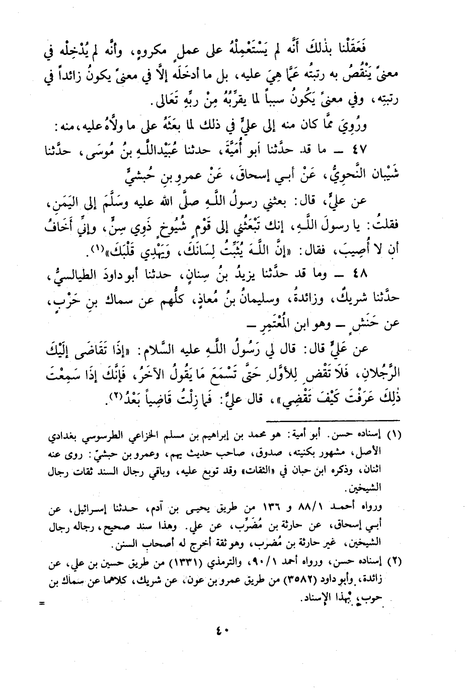 48 - وَمَا قَدْ حَدَّثَنَا يَزِيدُ بْنُ سِنَانٍ، حَدَّثَنَا أَبُو دَاوُدَ الطَّيَالِسِيُّ، حَدَّثَنَا شَرِيكٌ، وَزَائِدَةُ , وَسُلَيْمَانُ بْنُ مُعَاذٍ , كُلُّهُمْ عَنْ سِمَاكِ بْنِ حَرْبٍ، عَنْ حَنَشٍ وَهُوَ ابْنُ الْمُعْتَمِرِ، عَنْ عَلِيٍّ، قَالَ: قَالَ لِي رَسُولُ اللهِ عَلَيْهِ السَّلَامُ: " إذَا تَقَاضَى إلَيْكَ الرَّجُلَانِ , فَلَا تَقْضِ لِلْأَوَّلِ حَتَّى تَسْمَعَ مَا يَقُولُ الْآخَرُ , فَإِنَّكَ إذَا سَمِعْتَ ذَلِكَ عَرَفْتَ كَيْفَ تَقْضِي ". قَالَ عَلِيٌّ: فَمَا زِلْتُ قَاضِيًا بَعْدُ -[41]- وَزَادَ سُلَيْمَانُ أَنَّ النَّبِيَّ عَلَيْهِ السَّلَامُ قَالَ لِعَلِيٍّ فِي هَذَا الْحَدِيثِ: " إنَّ اللهَ يُثَبِّتُ لِسَانَكَ , وَيَهْدِي قَلْبَكَ "
