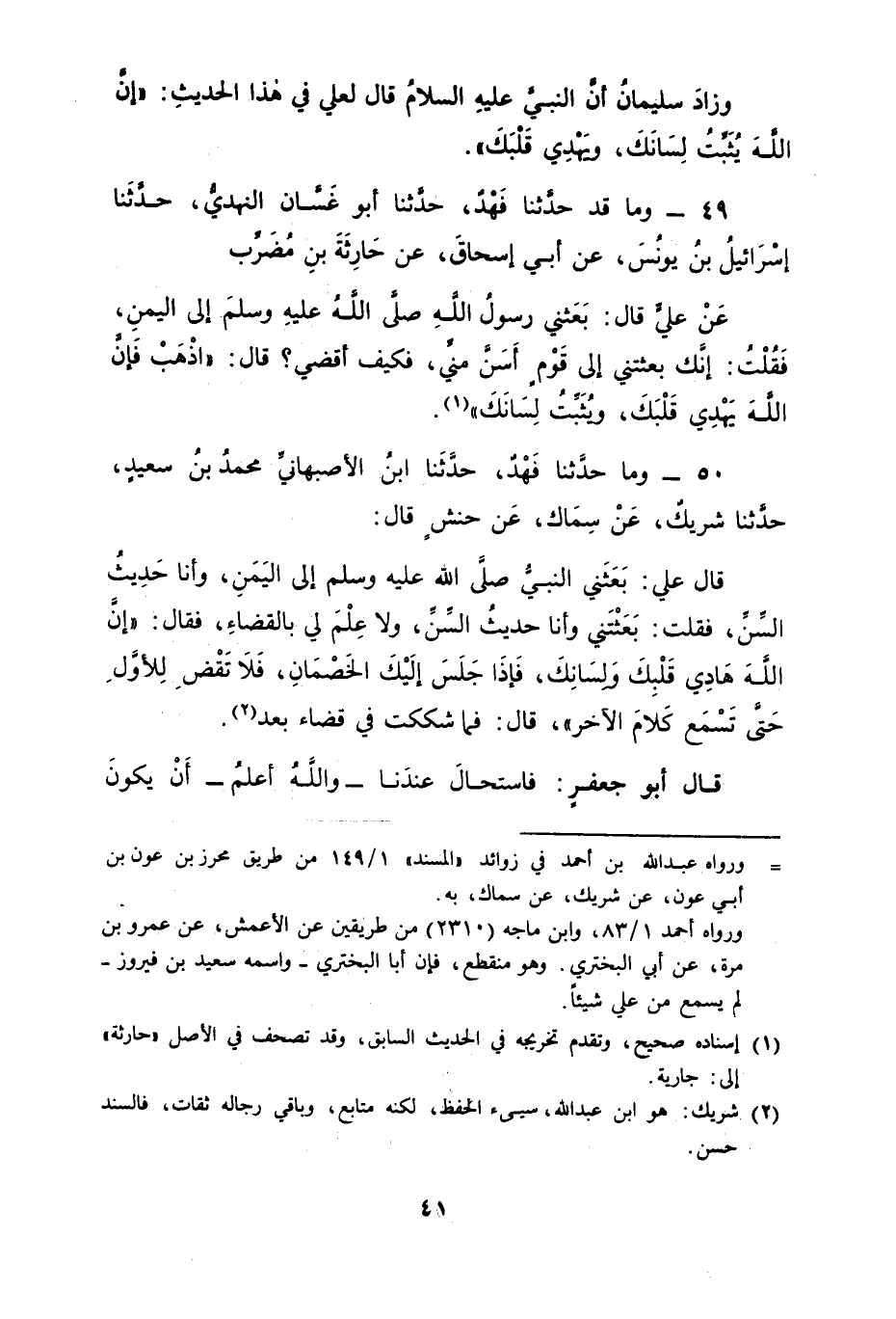 50 - وَمَا حَدَّثَنَا فَهْدٌ، حَدَّثَنَا ابْنُ الْأَصْبَهَانِيِّ مُحَمَّدُ بْنُ سَعِيدٍ , حَدَّثَنَا شَرِيكٌ، عَنْ سِمَاكٍ، عَنْ حَنَشٍ، قَالَ: قَالَ عَلِيٌّ: بَعَثَنِي النَّبِيُّ صَلَّى اللَّهُ عَلَيْهِ وَسَلَّمَ إلَى الْيَمَنِ , وَأَنَا حَدِيثُ السِّنِّ , فَقُلْتُ: بَعَثْتَنِي وَأَنَا حَدِيثُ السِّنِّ , وَلَا عِلْمَ لِي بِالْقَضَاءِ , فَقَالَ: " إنَّ اللهَ هَادِي قَلْبِكَ وَلِسَانِكَ , فَإِذَا جَلَسَ إلَيْكَ الْخَصْمَانِ , فَلَا تَقْضِ لِلْأَوَّلِ حَتَّى تَسْمَعَ كَلَامَ الْآخَرِ " قَالَ: فَمَا شَكَكْتُ فِي قَضَاءٍ بَعْدُ قَالَ أَبُو جَعْفَرٍ: فَاسْتَحَالَ عِنْدَنَا وَاللهُ أَعْلَمُ أَنْ يَكُونَ -[42]- رَسُولُ اللهِ عَلَيْهِ السَّلَامُ أَدْخَلَ عَلِيًّا إلَّا فِيمَا زَادَ فِي رُتْبَتِهِ , وَفِي جَلَالَةِ مِقْدَارِهِ , وَفِيمَا يُقَرِّبُهُ مِنْ رَبِّهِ تَعَالَى وَمِمَّا يَدْخُلُ فِي تَوْكِيدِ مَا ذَكَرْنَا