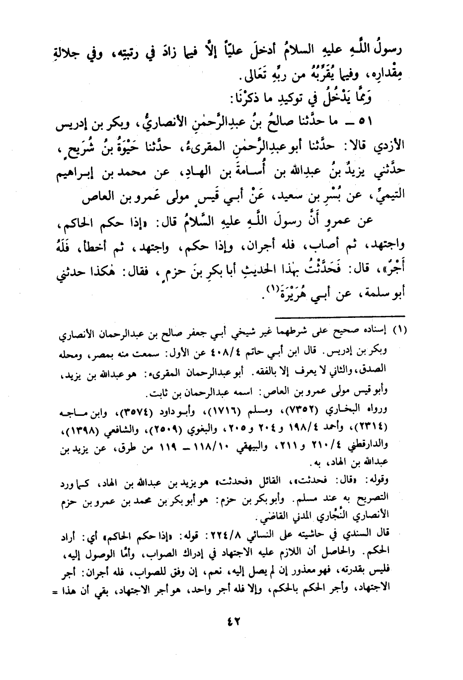 51 - مَا حَدَّثَنَا صَالِحُ بْنُ عَبْدِ الرَّحْمَنِ الْأَنْصَارِيُّ، وَبَكْرُ بْنُ إدْرِيسَ الْأَزْدِيُّ قَالَا: حَدَّثَنَا أَبُو عَبْدِ الرَّحْمَنِ الْمُقْرِئ، حَدَّثَنَا حَيْوَةُ بْنُ شُرَيْحٍ، حَدَّثَنِي يَزِيدُ بْنُ عَبْدِ اللهِ بْنِ أُسَامَةَ بْنِ الْهَادِ، عَنْ مُحَمَّدِ بْنِ إبْرَاهِيمَ التَّيْمِيِّ، عَنْ بُسْرِ بْنِ سَعِيدٍ، عَنْ أَبِي قَيْسٍ مَوْلَى عَمْرِو بْنِ الْعَاصِ، عَنْ عَمْرٍو، أَنَّ رَسُولَ اللهِ عَلَيْهِ السَّلَامُ قَالَ: " إذَا حَكَمَ الْحَاكِمُ , وَاجْتَهَدَ , ثُمَّ أَصَابَ , فَلَهُ أَجْرَانِ , وَإِذَا حَكَمَ , وَاجْتَهَدَ , ثُمَّ أَخْطَأَ , فَلَهُ أَجْرٌ ". قَالَ: فَحَدَّثْتُ بِهَذَا الْحَدِيثِ أَبَا بَكْرِ بْنَ حَزْمٍ , فَقَالَ: هَكَذَا حَدَّثَنِي أَبُو سَلَمَةَ , عَنْ أَبِي هُرَيْرَةَ. -[43]-