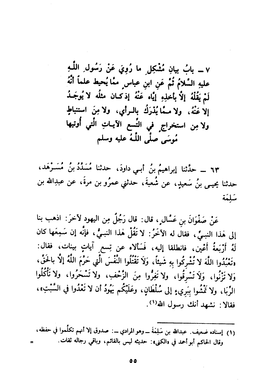 63 - حَدَّثَنَا إبْرَاهِيمُ بْنُ أَبِي دَاوُدَ، حَدَّثَنَا مُسَدِّدُ بْنُ مُسَرْهَدٍ، حَدَّثَنَا يَحْيَى بْنُ سَعِيدٍ، عَنْ شُعْبَةَ، حَدَّثَنِي عَمْرُو بْنُ مُرَّةَ، عَنْ عَبْدِ اللهِ بْنِ سَلَمَةَ، عَنْ صَفْوَانَ بْنِ عَسَّالٍ، قَالَ: قَالَ رَجُلٌ مِنَ الْيَهُودِ لِآخَرَ: اذْهَبْ بِنَا إلَى هَذَا النَّبِيِّ , فَقَالَ لَهُ الْآخَرُ: لَا تَقُلْ هَذَا النَّبِيَّ ; فَإِنَّهُ إنْ سَمِعَهَا كَانَ لَهُ أَرْبَعَةُ أَعْيُنٍ , فَانْطَلَقَا إلَيْهِ , فَسَأَلَاهُ عَنْ تِسْعِ آيَاتٍ بَيِّنَاتٍ , فَقَالَ: " تَعْبُدُوا اللهَ لَا تُشْرِكُوا بِهِ شَيْئًا , وَلَا تَقْتُلُوا النَّفْسَ الَّتِي حَرَّمَ اللهُ إلَّا بِالْحَقِّ , وَلَا تَزْنُوا , وَلَا تَسْرِقُوا , وَلَا تَفِرُّوا مِنَ الزَّحْفِ , وَلَا تُسْحِرُوا , وَلَا تَأْكُلُوا الرِّبَا , وَلَا تَمْشُوا بِبَرِيءٍ إلَى سُلْطَانٍ , وَعَلَيْكُمْ يَهُودَ أَنْ لَا تَعْدُوا فِي السَّبْتِ " فَقَالَا: نَشْهَدُ أَنَّكَ رَسُولُ اللهِ -[56]- قَالَ أَبُو جَعْفَرٍ: هَذَا الْحَرْفُ: نَشْهَدُ أَنَّكَ رَسُولُ اللهِ , لَمْ يَقُلْهُ أَحَدٌ فِي هَذَا الْحَدِيثِ مِنْ أَصْحَابِ شُعْبَةَ إلَّا يَحْيَى بْنَ سَعِيدٍ , فَكَانَ فِي هَذَا الْحَدِيثِ أَنَّ التِّسْعَ آيَاتٍ الَّتِي آتَاهَا اللهُ مُوسَى هِيَ التِّسْعُ الْآيَاتُ الْمَذْكُورَاتُ فِي هَذَا الْحَدِيثِ , وَأَنَّهَا عِبَادَاتٌ لَا نِذَارَاتٌ , وَلَا تَخْوِيفَاتٌ , وَلَا وَعِيدَاتٌ. وَمَا عَلِمْنَا أَحَدًا مِمَّنْ رَوَى هَذَا الْحَدِيثَ عَنْ شُعْبَةَ ضَبَطَ التِّسْعَ الْآيَاتِ الْمَذْكُورَاتِ فِيهِ غَيْرَ يَحْيَى , وَقَدْ ظَنَّ بَعْضُهُمْ أَنَّهُ قَدْ ضَبَطَهَا عَنْ شُعْبَةَ أَيْضًا بِضَبْطِ يَحْيَى إيَّاهَا عَنْهُ عَبْدُ اللهِ بْنُ إدْرِيسَ الْأَوْدِيُّ. وَذَكَرَ فِي ذَلِكَ