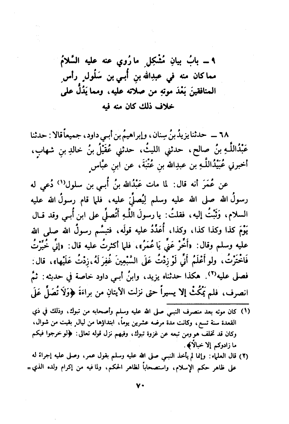 بَابُ بَيَانِ مُشْكِلِ مَا رُوِيَ عَنْهُ، عَلَيْهِ السَّلَامُ مِمَّا كَانَ مِنْهُ فِي عَبْدِ اللهِ بْنِ أُبَيِّ ابْنِ سَلُولَ رَأْسِ الْمُنَافِقِينَ بَعْدَ مَوْتِهِ مِنْ صَلَاتِهِ عَلَيْهِ وَمِمَّا يَدُلُّ عَلَى خِلَافِ ذَلِكَ كَانَ مِنْهُ فِيهِ