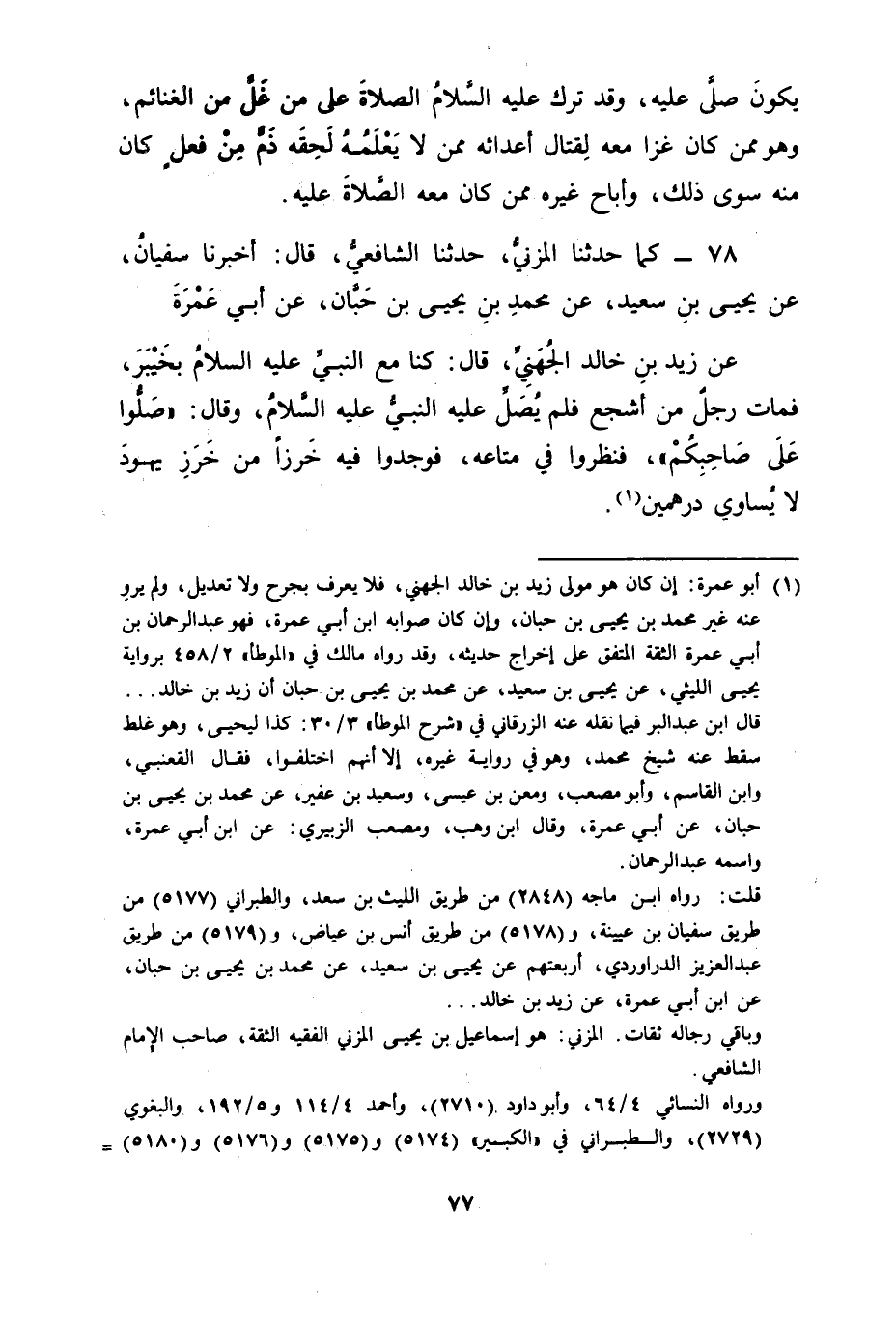 78 - كَمَا حَدَّثَنَا الْمُزَنِيُّ، حَدَّثَنَا الشَّافِعِيُّ، قَالَ: أَخْبَرَنَا سُفْيَانُ، عَنْ يَحْيَى بْنِ سَعِيدٍ، عَنْ مُحَمَّدِ بْنِ يَحْيَى بْنِ حِبَّانَ، عَنْ أَبِي عَمْرَةَ، عَنْ زَيْدِ بْنِ خَالِدٍ الْجُهَنِيِّ، قَالَ: كُنَّا مَعَ النَّبِيِّ عَلَيْهِ السَّلَامُ بِخَيْبَرَ فَمَاتَ رَجُلٌ مِنْ أَشْجَعَ فَلَمْ يُصَلِّ عَلَيْهِ النَّبِيُّ عَلَيْهِ السَّلَامُ وَقَالَ: " صَلُّوا عَلَى صَاحِبِكُمْ فَنَظَرُوا فِي مَتَاعِهِ فَوَجَدُوا فِيهِ خَرَزًا مِنْ خَرَزِ يَهُودَ لَا يُسَاوِي دِرْهَمَيْنِ "
