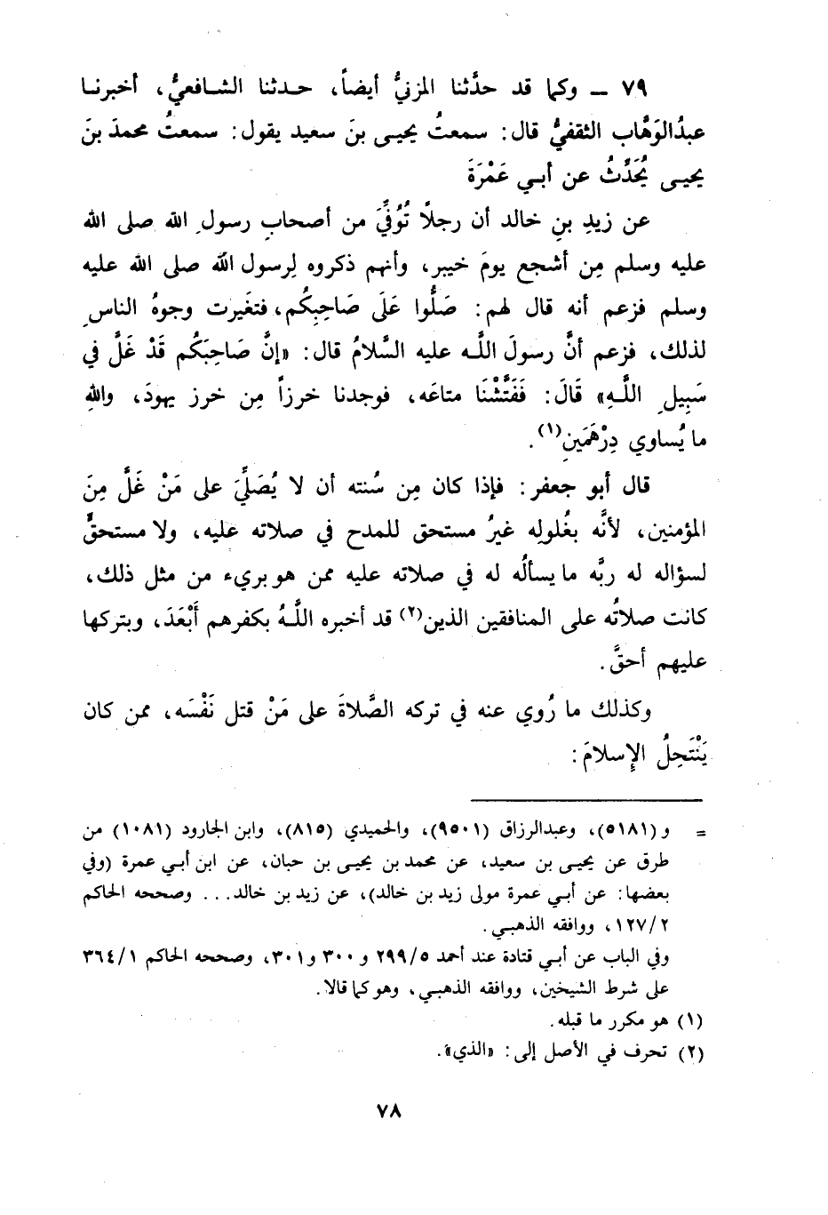 79 - وَكَمَا قَدْ حَدَّثَنَا الْمُزَنِيُّ أَيْضًا حَدَّثَنَا الشَّافِعِيُّ، أَخْبَرَنَا عَبْدُ الْوَهَّابِ الثَّقَفِيُّ، قَالَ: سَمِعْتُ يَحْيَى بْنَ سَعِيدٌ، يَقُولُ: سَمِعْتُ مُحَمَّدَ بْنَ يَحْيَى، يُحَدِّثُ عَنْ أَبِي عَمْرَةَ، عَنْ زَيْدِ بْنِ خَالِدٍ، أَنَّ رَجُلًا تُوُفِّيَ مِنْ أَصْحَابِ رَسُولِ اللهِ صَلَّى اللَّهُ عَلَيْهِ وَسَلَّمَ مِنْ أَشْجَعَ يَوْمَ خَيْبَرَ , وَأَنَّهُمْ ذَكَرُوهُ لِرَسُولِ اللهِ صَلَّى اللَّهُ عَلَيْهِ وَسَلَّمَ فَزَعَمَ أَنَّهُ قَالَ لَهُمْ: " صَلُّوا عَلَى صَاحِبِكُمْ " , فَتَغَيَّرَتْ وُجُوهُ النَّاسِ لِذَلِكَ فَزَعَمَ أَنَّ رَسُولَ اللهِ عَلَيْهِ السَّلَامُ قَالَ: " إنَّ صَاحِبَكُمْ قَدْ غَلَّ فِي سَبِيلِ اللهِ " قَالَ: فَفَتَّشْنَا مَتَاعَهُ فَوَجَدْنَا خَرَزًا مِنْ خَرَزِ يَهُودَ وَاللهِ مَا يُسَاوِي دِرْهَمَيْنِ. قَالَ أَبُو جَعْفَرٍ: فَإِذَا كَانَ مِنْ سُنَّتِهِ أَنْ لَا يُصَلِّيَ عَلَى مَنْ غَلَّ مِنَ الْمُؤْمِنِينَ ; لِأَنَّهُ بِغُلُولِهِ غَيْرُ مُسْتَحَقٍّ لِلْمَدْحِ فِي صَلَاتِهِ عَلَيْهِ وَلَا مُسْتَحَقٌّ لِسُؤَالِهِ لَهُ رَبَّهُ مَا يَسْأَلُهُ لَهُ فِي صَلَاتِهِ عَلَيْهِ مِمَّنْ هُوَ بَرِيءٌ مِنْ مِثْلِ ذَلِكَ كَانَتْ صَلَاتُهُ عَلَى الْمُنَافِقِينَ الَّذِينَ قَدْ أَخْبَرَهُ اللهُ بِكُفْرِهِمْ أَبْعَدَ وَبِتَرْكِهَا عَلَيْهِمْ أَحَقُّ , وَكَذَلِكَ مَا رُوِيَ عَنْهُ فِي تَرْكِهِ الصَّلَاةَ عَلَى مَنْ قَتَلَ نَفْسَهُ مِمَّنْ كَانَ يَنْتَحِلُ الْإِسْلَامَ