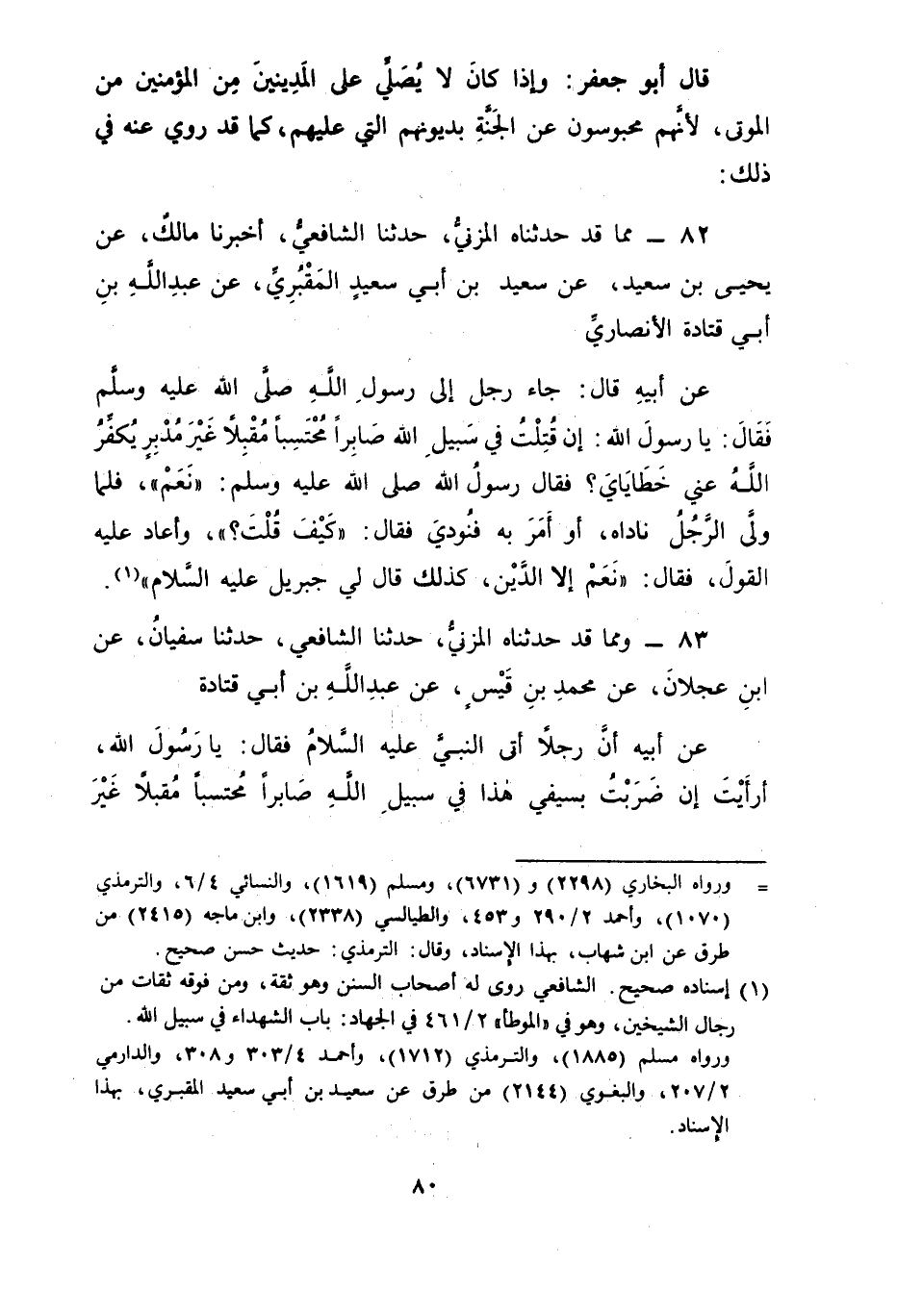 83 - وَمِمَّا قَدْ حَدَّثَنَاهُ الْمُزَنِيُّ، حَدَّثَنَا الشَّافِعِيُّ، حَدَّثَنَا سُفْيَانُ، عَنِ ابْنِ عَجْلَانَ، عَنْ مُحَمَّدِ بْنِ قَيْسٍ، عَنْ عَبْدِ اللهِ بْنِ أَبِي قَتَادَةَ، عَنْ أَبِيهِ، أَنَّ رَجُلًا أَتَى النَّبِيَّ عَلَيْهِ السَّلَامُ فَقَالَ: يَا رَسُولَ اللهِ أَرَأَيْتَ إنْ ضَرَبْتُ بِسَيْفِي هَذَا فِي سَبِيلِ اللهِ صَابِرًا مُحْتَسِبًا مُقْبِلًا غَيْرَ -[81]- مُدْبِرٍ أَتُكَفَّرُ عَنِّي خَطَايَايَ؟ فَقَالَ: " نَعَمْ " فَلَمَّا أَدْبَرَ قَالَ: " تَعَالَ هَذَا جِبْرِيلُ يَقُولُ: إلَّا أَنْ يَكُونَ عَلَيْكَ دَيْنٌ " قَالَ أَبُو جَعْفَرٍ: وَمَعْنَى قَوْلِهِ: أَتُكَفَّرُ عَنِّي خَطَايَايَ؟ أَيْ: أَدْخُلُ الْجَنَّةَ؟ فَأَجَابَهُ بِمَا أَجَابَهُ بِهِ فِي ذَلِكَ كَانَ بِأَنْ لَا يُصَلِّيَ عَلَى مَنْ هُوَ مَحْبُوسٌ عَنِ الْجَنَّةِ بِمَا هُوَ أَغْلَظُ مِنَ الدَّيْنِ أَحْرَى