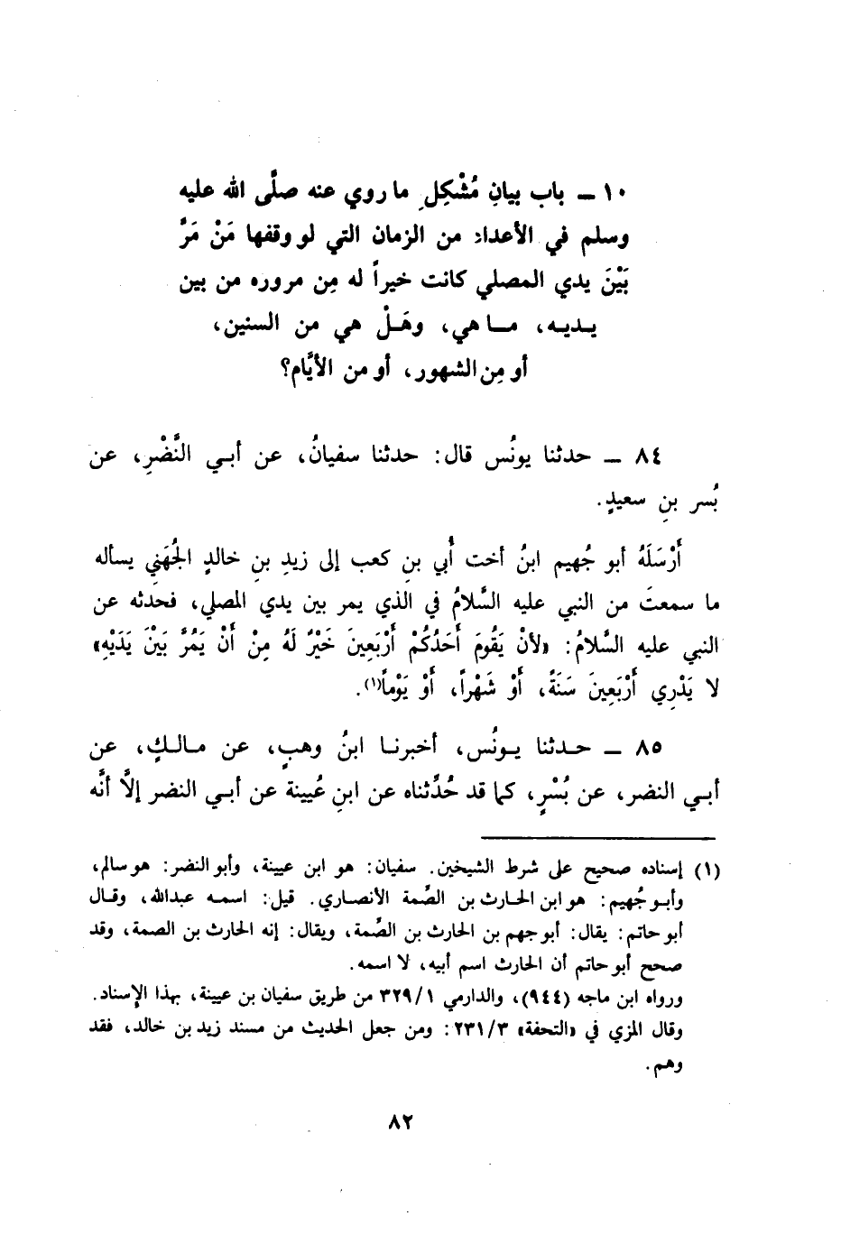 84 - حَدَّثَنَا يُونُسُ، قَالَ: حَدَّثَنَا سُفْيَانُ، عَنْ أَبِي النَّضْرِ، عَنْ بُسْرِ بْنِ سَعِيدٍ، أَرْسَلَهُ أَبُو جُهَيْمِ ابْنُ أُخْتِ أُبَيِّ بْنِ كَعْبٍ إلَى زَيْدِ بْنِ خَالِدٍ الْجُهَنِيِّ يَسْأَلُهُ مَا سَمِعْتَ مِنَ النَّبِيِّ عَلَيْهِ السَّلَامُ فِي الَّذِي يَمُرُّ بَيْنَ يَدَيِ الْمُصَلِّي فَحَدَّثَهُ عَنِ النَّبِيِّ عَلَيْهِ السَّلَامُ: " لَأَنْ يَقُومَ أَحَدُكُمْ أَرْبَعِينَ خَيْرٌ لَهُ مِنْ أَنْ يَمُرَّ بَيْنَ يَدَيْهِ لَا يَدْرِي أَرْبَعِينَ سَنَةً أَوْ شَهْرًا أَوْ يَوْمًا "