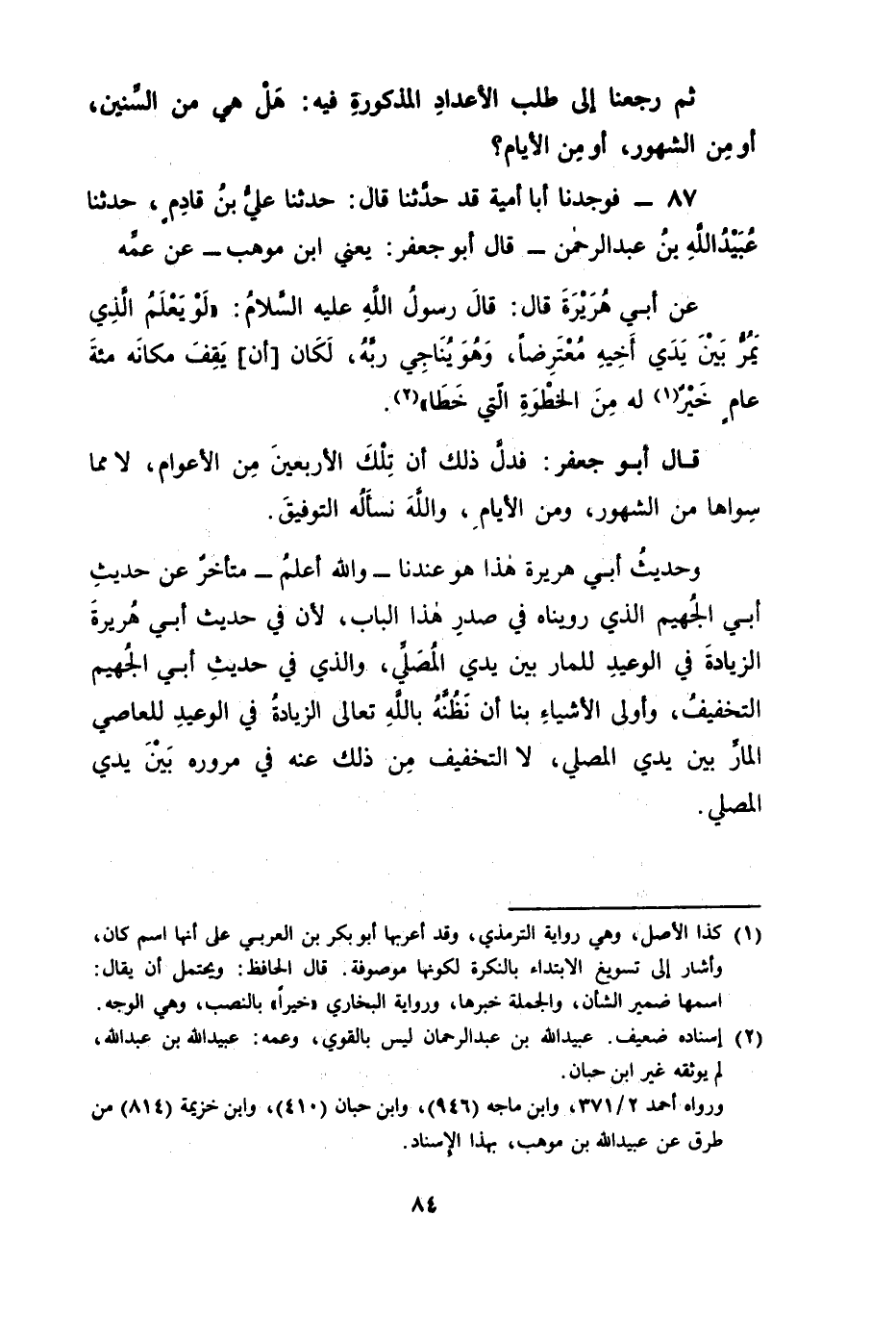 87 - فَوَجَدْنَا أَبَا أُمَيَّةَ قَدْ حَدَّثَنَا قَالَ: حَدَّثَنَا عَلِيُّ بْنُ قَادِمٍ، حَدَّثَنَا عُبَيْدُ اللهِ بْنُ عَبْدِ الرَّحْمَنِ، قَالَ أَبُو جَعْفَرٍ: يَعْنِي ابْنَ وَهْبٍ، عَنْ عَمِّهِ، عَنْ أَبِي هُرَيْرَةَ، قَالَ: قَالَ رَسُولُ اللهِ عَلَيْهِ السَّلَامُ: " لَوْ يَعْلَمُ الَّذِي يَمُرُّ بَيْنَ يَدَيْ أَخِيهِ مُعْتَرِضًا وَهُوَ يُنَاجِي رَبَّهُ لَكَانَ أَنْ يَقِفَ مَكَانَهُ مِئَةَ عَامٍ خَيْرٌ لَهُ مِنَ الْخُطْوَةِ الَّتِي خَطَا " قَالَ أَبُو جَعْفَرٍ: فَدَلَّ ذَلِكَ أَنَّ تِلْكَ الْأَرْبَعِينَ مِنَ الْأَعْوَامِ لَا مِمَّا سِوَاهَا مِنَ الشُّهُورِ وَمِنَ الْأَيَّامِ وَاللهَ نَسْأَلُهُ التَّوْفِيقَ. وَحَدِيثُ أَبِي هُرَيْرَةَ هَذَا هُوَ عِنْدَنَا وَاللهُ أَعْلَمُ مُتَأَخِّرٌ عَنْ حَدِيثِ أَبِي الْجُهَيْمِ الَّذِي رَوَيْنَاهُ فِي صَدْرِ هَذَا الْبَابِ ; لِأَنَّ فِي حَدِيثِ أَبِي هُرَيْرَةَ الزِّيَادَةَ فِي الْوَعِيدِ لِلْمَارِّ بَيْنَ يَدَيِ الْمُصَلِّي وَالَّذِي فِي حَدِيثِ أَبِي الْجُهَيْمِ التَّخْفِيفُ وَأَوْلَى الْأَشْيَاءِ بِنَا أَنْ نَظُنَّهُ بِاللهِ تَعَالَى الزِّيَادَةُ فِي الْوَعِيدِ لِلْعَاصِي الْمَارِّ بَيْنَ يَدَيِ الْمُصَلِّي لَا التَّخْفِيفُ مِنْ ذَلِكَ عَنْهُ فِي مُرُورِهِ بَيْنَ يَدَيِ الْمُصَلِّي