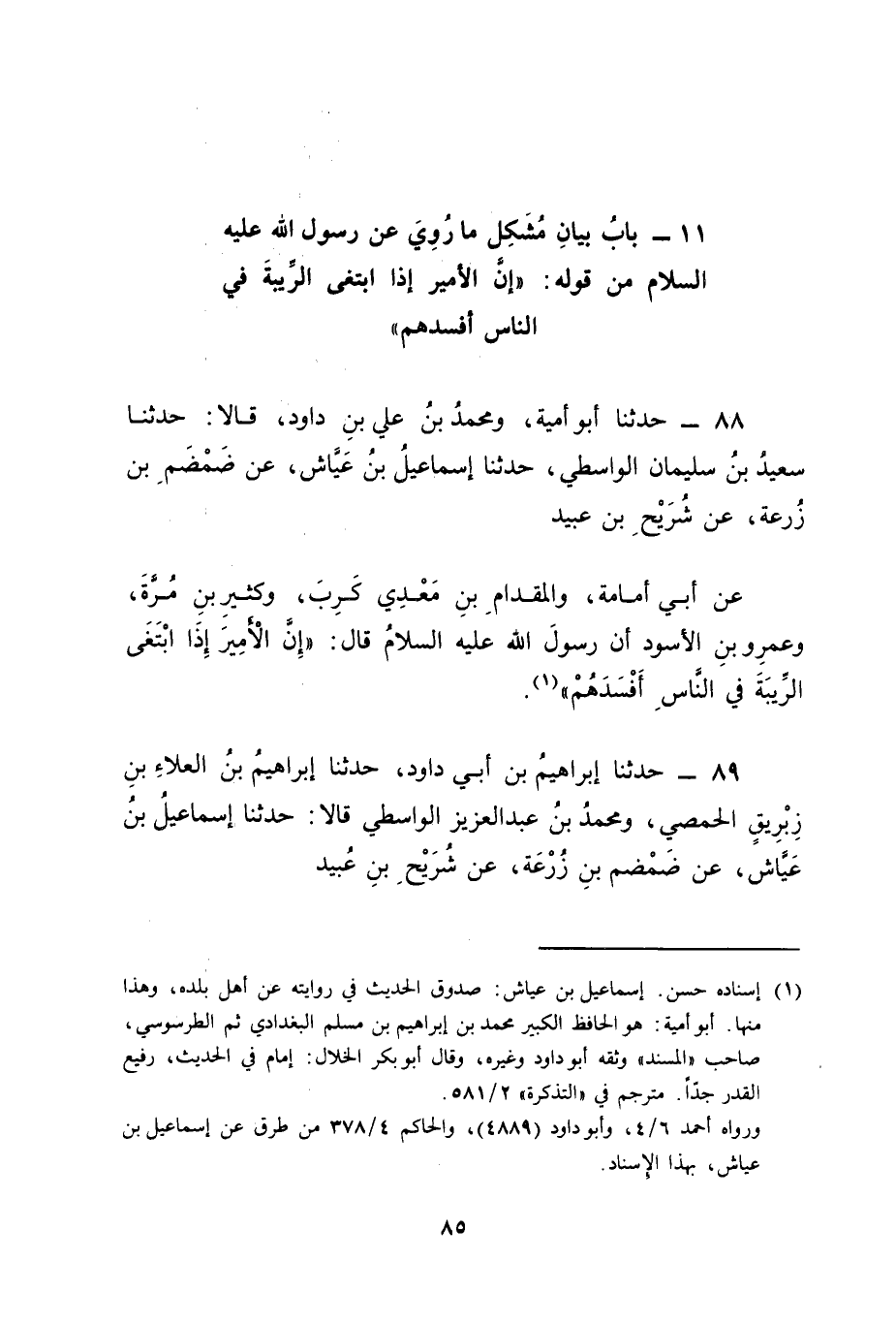 88 - حَدَّثَنَا أَبُو أُمَيَّةَ، وَمُحَمَّدُ بْنُ عَلِيِّ بْنِ دَاوُدَ، قَالَا: حَدَّثَنَا سَعِيدُ بْنُ سُلَيْمَانَ الْوَاسِطِيُّ، حَدَّثَنَا إسْمَاعِيلُ بْنُ عَيَّاشٍ، عَنْ ضَمْضَمِ بْنِ زُرْعَةَ، عَنْ شُرَيْحِ بْنِ عُبَيْدٍ، عَنْ أَبِي أُمَامَةَ، وَالْمِقْدَامِ بْنِ مَعْدِي كَرِبَ , وَكَثِيرِ بْنِ مُرَّةَ، وَعَمْرِو بْنِ الْأَسْوَدِ أَنَّ رَسُولَ اللهِ عَلَيْهِ السَّلَامُ قَالَ: " إنَّ الْأَمِيرَ إذَا ابْتَغَى الرِّيبَةَ فِي النَّاسِ أَفْسَدَهُمْ "