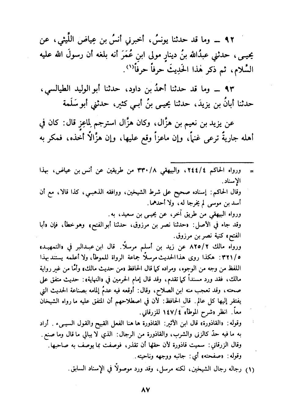 93 - وَمَا قَدْ حَدَّثَنَا أَحْمَدُ بْنُ دَاوُدَ، حَدَّثَنَا أَبُو الْوَلِيدِ الطَّيَالِسِيُّ، حَدَّثَنَا أَبَانُ بْنُ يَزِيدَ، حَدَّثَنَا يَحْيَى بْنُ أَبِي كَثِيرٍ، حَدَّثَنِي أَبُو سَلَمَةَ، عَنْ يَزِيدَ بْنِ نُعَيْمِ بْنِ هَزَّالٍ، وَكَانَ هَزَّالٌ اسْتَرْجَمَ لِمَاعِزٍ قَالَ: كَانَ فِي أَهْلِهِ جَارِيَةٌ تَرْعَى غَنَمًا , وَإِنَّ مَاعِزًا وَقَعَ عَلَيْهَا , وَإِنَّ هَزَّالًا أَخَذَهُ فَمَكَرَ بِهِ -[88]- وَخَدَعَهُ، فَقَالَ انْطَلِقْ إلَى رَسُولِ اللهِ صَلَّى اللَّهُ عَلَيْهِ وَسَلَّمَ فَنُخْبِرُهُ بِالَّذِي صَنَعْتَ عَسَى أَنْ يَنْزِلَ فِيكَ قُرْآنٌ فَأَمَرَ بِهِ نَبِيُّ اللهِ عَلَيْهِ السَّلَامُ أَنْ يُرْجَمَ فَرُجِمَ , فَلَمَّا عَضَّهُ مَسُّ الْحِجَارَةِ انْطَلَقَ يَسْعَى فَاسْتَقْبَلَهُ رَجُلٌ بِلَحْيِ بَعِيرٍ فَضَرَبَهُ فَصَرَعَهُ، فَقَالَ النَّبِيُّ عَلَيْهِ السَّلَامُ: " يَا هَزَّالُ لَوْ كُنْتَ سَتَرْتَهُ بِثَوْبِكَ كَانَ خَيْرًا لَكَ " قَالَ أَبُو جَعْفَرٍ: وَكَأَنَّ الْأَمِيرُ إذَا تَتَبَّعَ مَا قَدْ أَمَرَ اللهُ بِتَرْكِ تَتَبُّعِهِ امْتَثَلَ النَّاسُ ذَلِكَ مِنْهُ وَكَانَ فِي ذَلِكَ فَسَادُهُمْ. فَإِنْ قَالَ قَائِلٌ فَكَيْفَ يَكُونُ مَا ذَكَرْتَ كَمَا ذَكَرْتَ , وَقَدْ أَمَرَ النَّبِيُّ عَلَيْهِ السَّلَامُ أُنَيْسًا الْأَسْلَمِيَّ أَنْ يَأْتِيَ امْرَأَةَ الرَّجُلِ الَّذِي ذُكِرَ لَهُ عَنْهَا أَنَّهَا زَنَتْ فَيَسْأَلَهَا عَنْ ذَلِكَ وَأَنْ يَرْجُمَهَا إنِ اعْتَرَفَتْ عِنْدَهُ بِذَلِكَ. وَذَكَرَ فِي ذَلِكَ