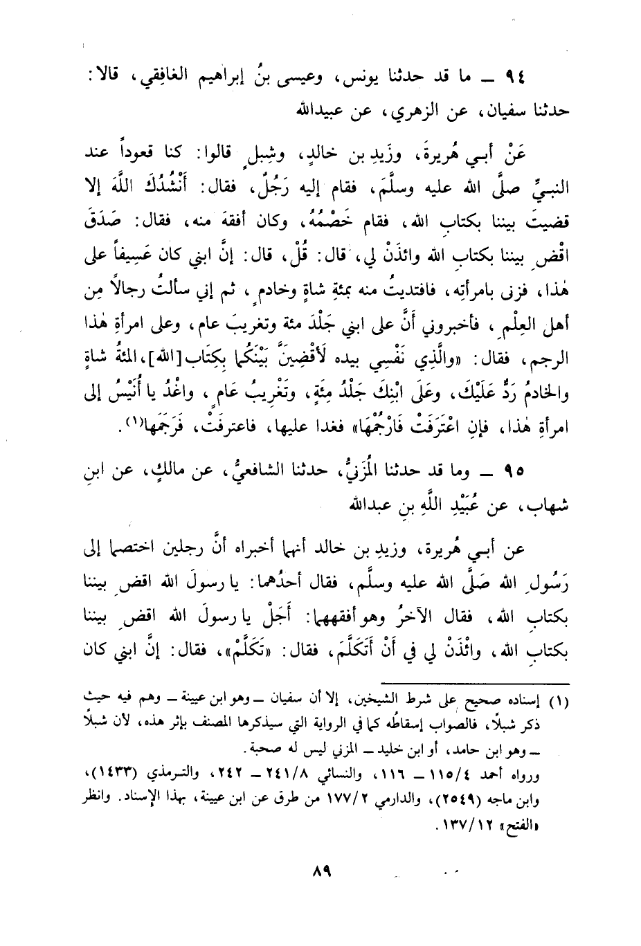 95 - وَمَا قَدْ حَدَّثَنَا الْمُزَنِيُّ، حَدَّثَنَا الشَّافِعِيُّ، عَنْ مَالِكٍ، عَنِ ابْنِ شِهَابٍ، عَنْ عُبَيْدِ اللهِ بْنِ عَبْدِ اللهِ، عَنْ أَبِي هُرَيْرَةَ، وَزَيْدِ بْنِ خَالِدٍ أَنَّهُمَا أَخْبَرَاهُ أَنَّ رَجُلَيْنِ اخْتَصَمَا إلَى رَسُولِ اللهِ صَلَّى اللَّهُ عَلَيْهِ وَسَلَّمَ فَقَالَ أَحَدُهُمَا: يَا رَسُولَ اللهِ اقْضِ بَيْنَنَا بِكِتَابِ اللهِ , فَقَالَ الْآخَرُ وَهُوَ أَفْقَهُهُمَا: أَجَلْ يَا رَسُولَ اللهِ اقْضِ بَيْنَنَا بِكِتَابِ اللهِ وَائْذَنْ لِي فِي أَنْ أَتَكَلَّمَ فَقَالَ: " تَكَلَّمْ " فَقَالَ: إنَّ ابْنِي كَانَ -[90]- عَسِيفًا عَلَى هَذَا فَزَنَى بِامْرَأَتِهِ فَأُخْبِرْتُ أَنَّ عَلَى ابْنِي الرَّجْمَ فَافْتَدَيْتُ مِنْهُ بِماِئَةِ شَاةٍ وَبِجَارِيَةٍ , ثُمَّ إنِّي سَأَلْتُ أَهْلَ الْعِلْمِ فَأَخْبَرُونِي أَنَّ عَلَى ابْنِي جَلْدَ مِائَةٍ وَتَغْرِيبَ عَامٍ , وَإِنَّمَا الرَّجْمُ عَلَى امْرَأَتِهِ، فَقَالَ رَسُولُ اللهِ صَلَّى اللَّهُ عَلَيْهِ وَسَلَّمَ: " أَمَا وَالَّذِي نَفْسِي بِيَدِهِ لَأَقْضِيَنَّ بَيْنَكُمَا بِكِتَابِ اللهِ أَمَّا غَنَمُكَ وَجَارِيَتُكَ فَرَدٌّ عَلَيْكَ " , وَجَلَدَ ابْنَهُ مِائَةً وَغَرَّبَهُ عَامًا , وَأَمَرَ أُنَيْسًا الْأَسْلَمِيَّ أَنْ يَأْتِيَ امْرَأَةَ الْآخَرِ فَإِنِ اعْتَرَفَتْ رَجَمَهَا , فَاعْتَرَفَتْ فَرَجَمَهَا قَالَ مَالِكٌ: وَالْعَسِيفُ: الْأَجِيرُ