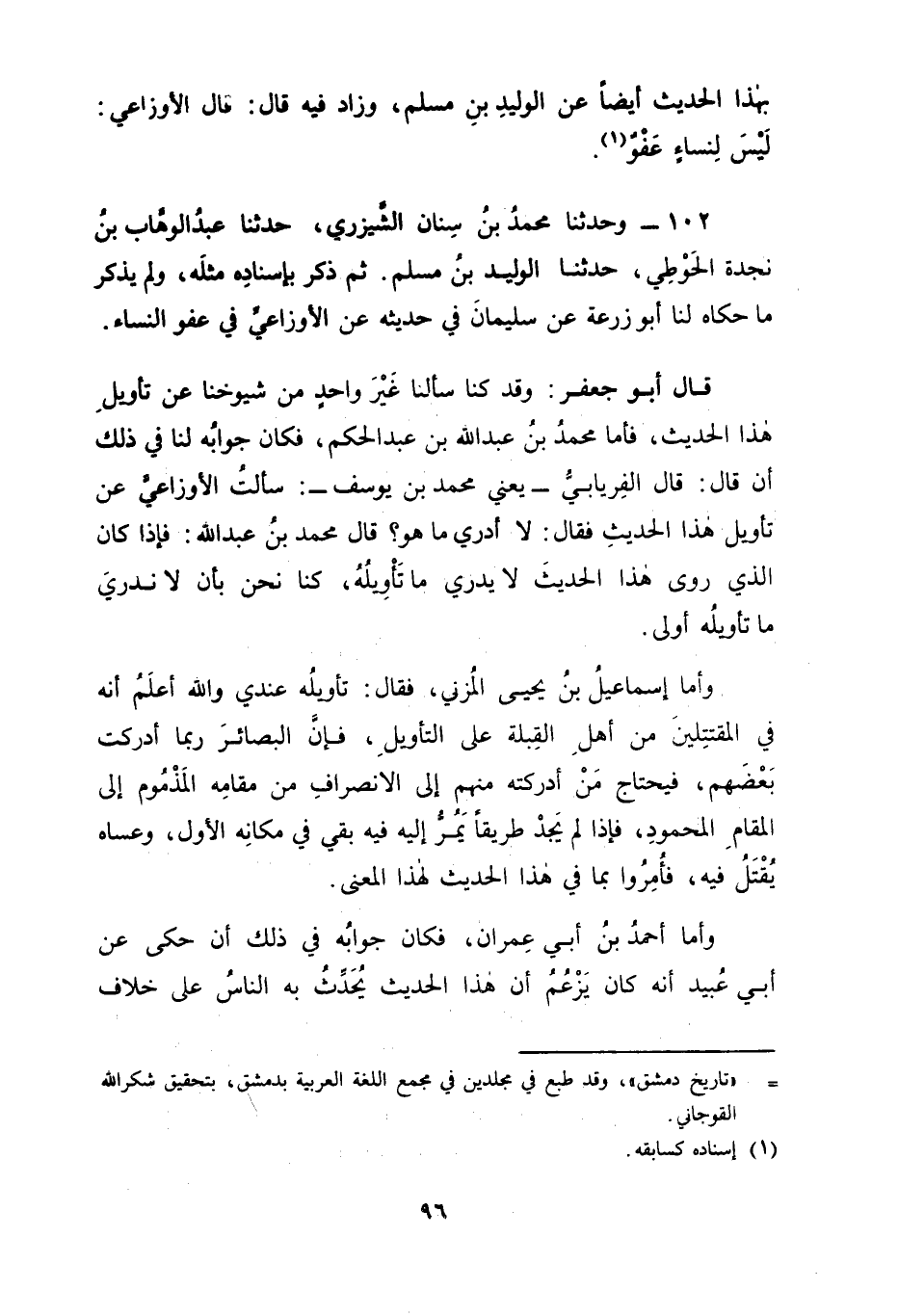 وَأَمَّا أَحْمَدُ بْنُ أَبِي عِمْرَانَ فَكَانَ جَوَابَهُ فِي ذَلِكَ أَنْ حَكَى عَنْ أَبِي عُبَيْدٍ أَنَّهُ كَانَ يَزْعُمُ أَنَّ هَذَا الْحَدِيثَ يُحَدِّثُ بِهِ النَّاسُ عَلَى خِلَافِ -[97]- مَا هُوَ عَلَيْهِ فِي الْحَقِيقَةِ، وَيَذْكُرُ أَنَّهُ بَلَغَهُ عَنِ الْوَلِيدِ بْنِ مُسْلِمٍ أَنَّهُ كَانَ يُحَدِّثُ بِهِ , عَنِ الْأَوْزَاعِيِّ , عَنْ حِصْنٍ , عَنْ أَبِي سَلَمَةَ , عَنْ عَائِشَةَ أَنَّ النَّبِيَّ عَلَيْهِ السَّلَامُ قَالَ: " لِأَهْلِ الْقَتِيلِ أَنْ يَنْحَجِزُوا الْأَدْنَى فَالْأَدْنَى وَإِنْ كَانَتِ امْرَأَةً " قَالَ أَبُوعُبَيْدٍ: وَهَذَا الِانْحِجَازُ هُوَ الْعَفْوُ عَنِ الدَّمِ وَفِي هَذَا الْحَدِيثِ مَا قَدْ دَلَّ عَلَى جَوَازِ عَفْوِ النِّسَاءِ عَنِ الدَّمِ الْعَمْدِ كَمَا يَجُوزُ عَفْوُ الرِّجَالِ عَنْهُ كُلُّ هَذَا مِنْ كَلَامِ أَبِي عُبَيْدٍ -[98]- قَالَ: أَبُو جَعْفَرٍ: فَتَأَمَّلْنَا نَحْنُ ذَلِكَ فَوَجَدْنَا مَا ذَكَرَهُ أَبُو عُبَيْدٍ مِنْ هَذَا وَهْمًا مِنْهُ إذْ كَانَ أَصْحَابُ الْوَلِيدِ مِنْ أَهْلِ الشَّامِ الَّذِينَ رَوَوْا هَذَا الْحَدِيثَ عَنْهُ هُمُ الْحُجَّةَ فِي حَدِيثِهِ , قَدْ رَوَوْهُ عَنْهُ بِخِلَافِ مَا بَلَغَ أَبَا عُبَيْدٍ عَنْهُ أَنَّهُ كَانَ يُحَدِّثُهُ فَمَا رَوَوْا مِنْ ذَلِكَ أَوْلَى مِمَّا بَلَغَهُ لَا سِيَّمَا وَمَعَهُمْ سَمَاعُهُمْ إيَّاهُ مِنَ الْوَلِيدِ وَإِنَّمَا مَعَهُ هُوَ بَلَاغُهُ إيَّاهُ عَنِ الْوَلِيدِ , وَقَدْ تَابَعَهُمْ عَلَى ذَلِكَ عَنِ الْأَوْزَاعِيِّ بِشْرُ بْنُ بَكْرٍ فَرَوَاهُ عَنِ الْأَوْزَاعِيِّ كَمَا رَوَوْهُ عَنِ الْوَلِيدِ عَنِ الْأَوْزَاعِيِّ وَلَمَّا انْتَفَى ذَلِكَ لَمْ يَكُنْ تَأْوِيلُهُ أَحْسَنَ مِمَّا ذَكَرْنَاهُ فِيهِ عَنِ الْمُزَنِيِّ غَيْرَ أَنَّ بَعْضَ النَّاسِ مِنْ أَهْلِ الْعِلْمِ قَدْ ذَكَرَ أَنَّهُ يَدْخُلُ فِي ذَلِكَ أَيْضًا الْمُقْتَتِلُونَ مِنَ الْمُسْلِمِينَ فِي قِتَالِهِمْ أَهْلَ الْحَرْبِ إذْ كَانَ قَدْ يَجُوزُ أَنْ يَطْرَأَ عَلَيْهِمْ مِنْ أَهْلِ الْحَرْبِ مَنْ مَعَهُ الْعَدَدُ الَّذِي يُبِيحُ لَهُمُ الِانْصِرَافَ عَنْ قِتَالِهِ إلَى فِئَةِ الْمُسْلِمِينَ الَّذِينَ يَقْوَوْنَ بِهَا عَلَى عَدُوِّهِمْ فَيُقَاتِلُونَهُمْ مَعَهُمْ وَلَيْسَ هَذَا التَّأْوِيلُ بِبَعِيدٍ مِمَّا قَالَ قَالَ أَبُو جَعْفَرٍ: وَقَدْ ذَكَرْنَا فِي هَذَا الْبَابِ مِنْ قَوْلِ الْأَوْزَاعِيِّ عُقَيْبًا لِهَذَا الْحَدِيثِ: لَيْسَ لِلنِّسَاءِ عَفْوٌ فَدَلَّ ذَلِكَ عَلَى أَنَّ الْأَوْزَاعِيِّ قَدْ كَانَ عِنْدَ هَذَا الْقَوْلِ أَنَّ ذَلِكَ الْحَدِيثَ عَلَى نَحْوِ مَا حَكَاهُ أَبُو عُبَيْدٍ بَلَاغًا عَنِ الْوَلِيدِ فِي الْعَفْوِ عَنِ الدَّمِ ثُمَّ خَالَفَهُ الْأَوْزَاعِيِّ بِأَنْ قَالَ: لَيْسَ لِلنِّسَاءِ عَفْوٌ