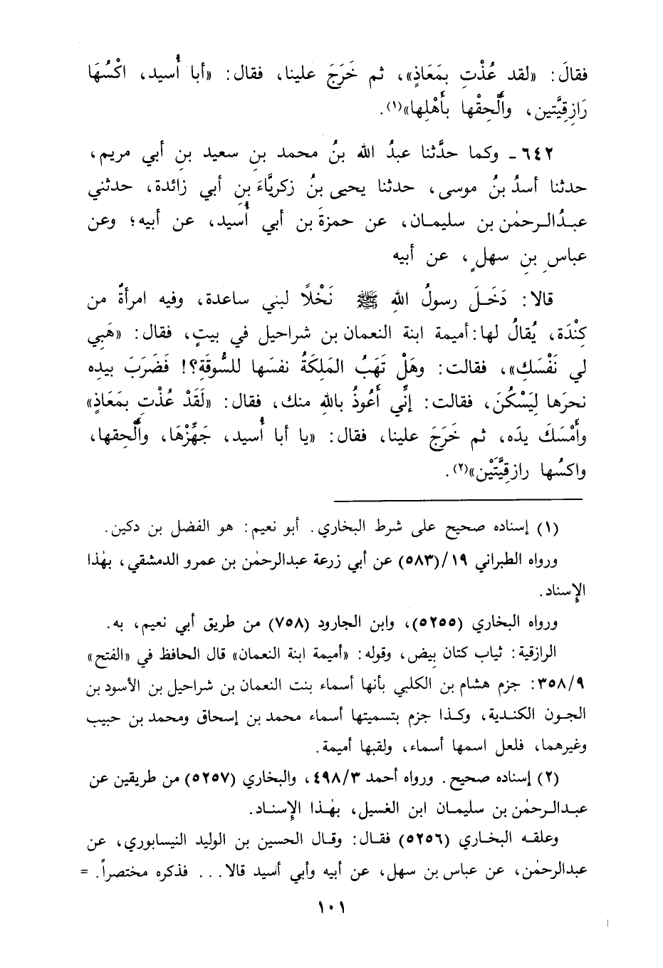 642 - وَكَمَا حَدَّثَنَا عَبْدُ اللهِ بْنُ مُحَمَّدِ بْنِ سَعِيدِ بْنِ أَبِي مَرْيَمَ، حَدَّثَنَا أَسَدُ بْنُ مُوسَى، حَدَّثَنَا يَحْيَى بْنُ زَكَرِيَّاءَ بْنِ أَبِي زَائِدَةَ، حَدَّثَنِي عَبْدُ الرَّحْمَنِ بْنِ سُلَيْمَانَ، عَنْ حَمْزَةَ بْنِ أَبِي أُسَيْدٍ، عَنْ أَبِيهِ، وَعَنْ عَبَّاسِ بْنِ سَهْلٍ، عَنْ أَبِيهِ قَالَا: دَخَلَ رَسُولُ اللهِ صَلَّى اللَّهُ عَلَيْهِ وَسَلَّمَ نَخْلًا لِبَنِي سَاعِدَةَ، وَفِيهِ امْرَأَةٌ مِنْ كِنْدَةَ يُقَالُ لَهَا: أُمَيْمَةُ ابْنَةُ النُّعْمَانِ بْنِ شَرَاحِيلَ فِي بَيْتٍ فَقَالَ: " هَبِي لِي نَفْسَكِ " فَقَالَتْ: وَهَلْ تَهَبُ الْمَلِكَةُ نَفْسَهَا لِلسُّوقَةِ؟ فَضَرَبَ بِيَدِهِ نَحْرَهَا لِيَسْكُنَ فَقَالَتْ: إنِّي أَعُوذُ بِاللهِ مِنْكَ، فَقَالَ: " لَقَدْ عُذْتِ بِمَعَاذٍ " وَأَمْسَكَ يَدَهُ، ثُمَّ خَرَجَ عَلَيْنَا فَقَالَ: " يَا أَبَا أُسَيْدٍ جَهِّزْهَا، وَأَلْحِقْهَا وَاكْسُهَا رَازِقِيَّتَيْنِ "