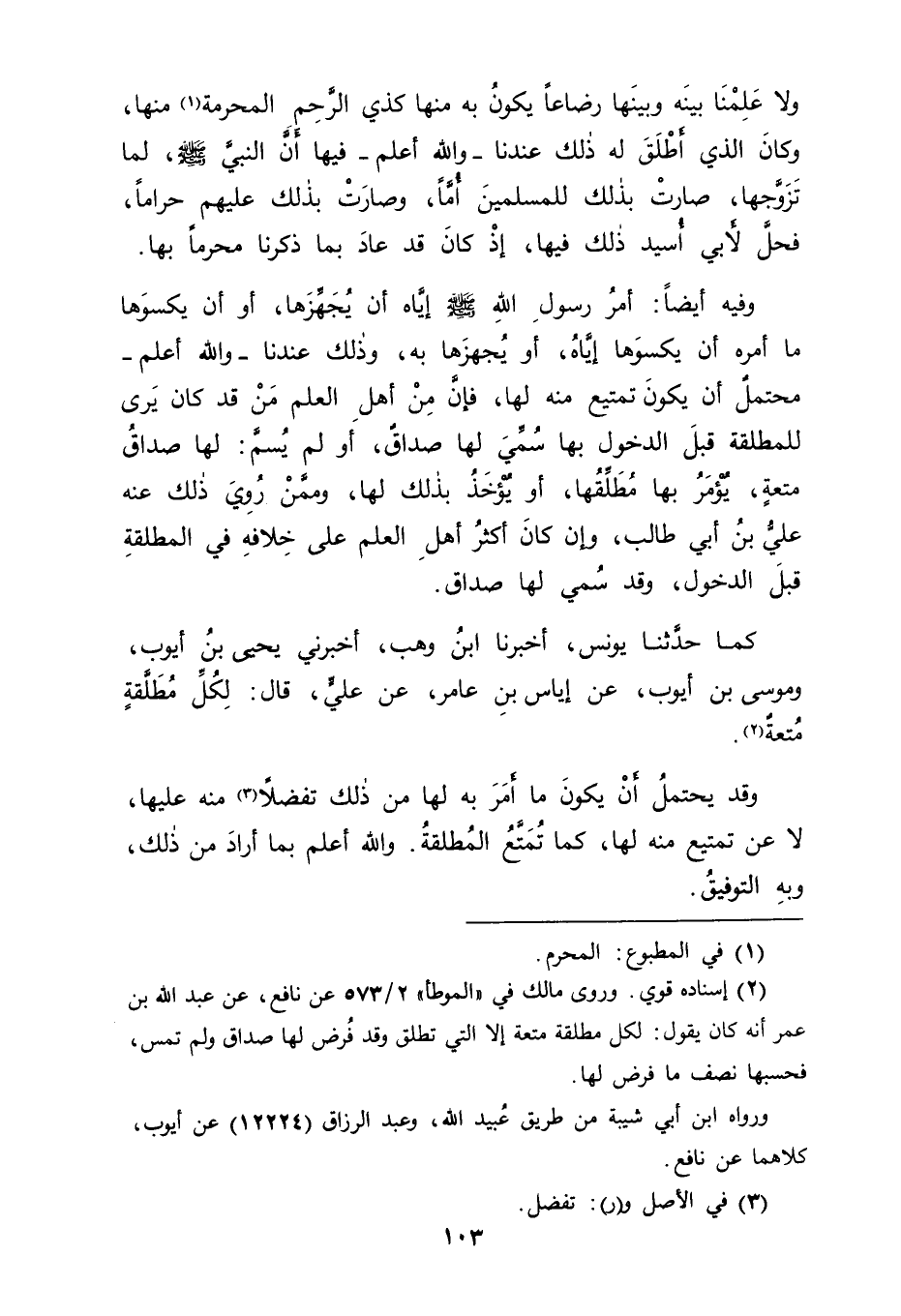 وَمِمَّنْ رُوِيَ ذَلِكَ عَنْهُ عَلِيُّ بْنُ أَبِي طَالِبٍ وَإِنْ كَانَ أَكْثَرُ أَهْلِ الْعِلْمِ عَلَى خِلَافِهِ فِي الْمُطَلَّقَةِ قَبْلَ الدُّخُولِ، وَقَدْ سُمِّيَ لَهَا صَدَاقٌ، كَمَا حَدَّثَنَا يُونُسُ أَخْبَرَنَا ابْنُ وَهْبٍ، أَخْبَرَنِي يَحْيَى بْنُ أَيُّوبَ، وَمُوسَى بْنُ أَيُّوبَ، عَنْ إيَاسِ بْنِ عَامِرٍ، عَنْ عَلِيٍّ قَالَ: " لِكُلِّ مُطَلَّقَةٍ مُتْعَةٌ " وَقَدْ يُحْتَمَلُ أَنْ يَكُونَ مَا أَمَرَ بِهِ لَهَا مِنْ ذَلِكَ تَفَضُّلًا مِنْهُ عَلَيْهَا لَا عَنْ تَمْتِيعٍ مِنْهُ لَهَا كَمَا تُمَتَّعُ الْمُطَلَّقَةُ، وَاللهُ أَعْلَمُ بِمَا أَرَادَ مِنْ ذَلِكَ، وَبِاللهِ التَّوْفِيقُ