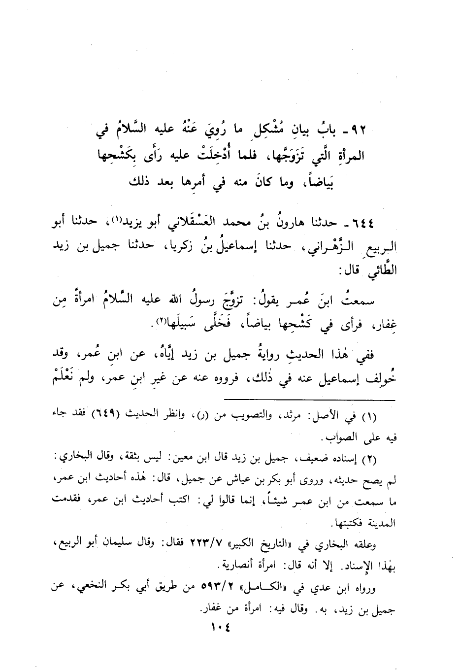 644 - حَدَّثَنَا هَارُونُ بْنُ مُحَمَّدٍ الْعَسْقَلَانِيُّ أَبُو يَزِيدَ، حَدَّثَنَا أَبُو الرَّبِيعِ الزَّهْرَانِيُّ، حَدَّثَنَا إسْمَاعِيلُ بْنُ زَكَرِيَّا، حَدَّثَنَا جَمِيلُ بْنُ زَيْدٍ الطَّائِيُّ قَالَ: سَمِعْتُ ابْنَ عُمَرَ، يَقُولُ: " تَزَوَّجَ رَسُولُ اللهِ عَلَيْهِ السَّلَامُ امْرَأَةً مِنْ غِفَارٍ فَرَأَى فِي كَشْحِهَا بَيَاضًا فَخَلَّى سَبِيلَهَا " فَفِي هَذَا الْحَدِيثِ رِوَايَةُ جَمِيلِ بْنِ زَيْدٍ إيَّاهُ عَنِ ابْنِ عُمَرَ، وَقَدْ خُولِفَ إسْمَاعِيلُ عَنْهُ فِي ذَلِكَ فَرَوَوْهُ عَنْهُ عَنْ غَيْرِ ابْنِ عُمَرَ وَلَمْ نَعْلَمْ -[105]- أَحَدًا وَافَقَ إسْمَاعِيلَ بْنَ زَكَرِيَّا عَنْهُ فِي ذَلِكَ غَيْرُ الْقَاسِمِ بْنِ غُصْنٍ. فَإِنَّ مُحَمَّدَ بْنَ إسْمَاعِيلَ الْبُخَارِيَّ ذَكَرَ عَنْ مُحَمَّدِ بْنِ عَبْدِ الْعَزِيزِ الْوَاسِطِيِّ، عَنِ الْقَاسِمِ بْنِ غُصْنٍ، سَمِعَ جَمِيلَ بْنَ زَيْدٍ، عَنِ ابْنِ عُمَرَ، ثُمَّ ذَكَرَ مِثْلَهُ سَوَاءً