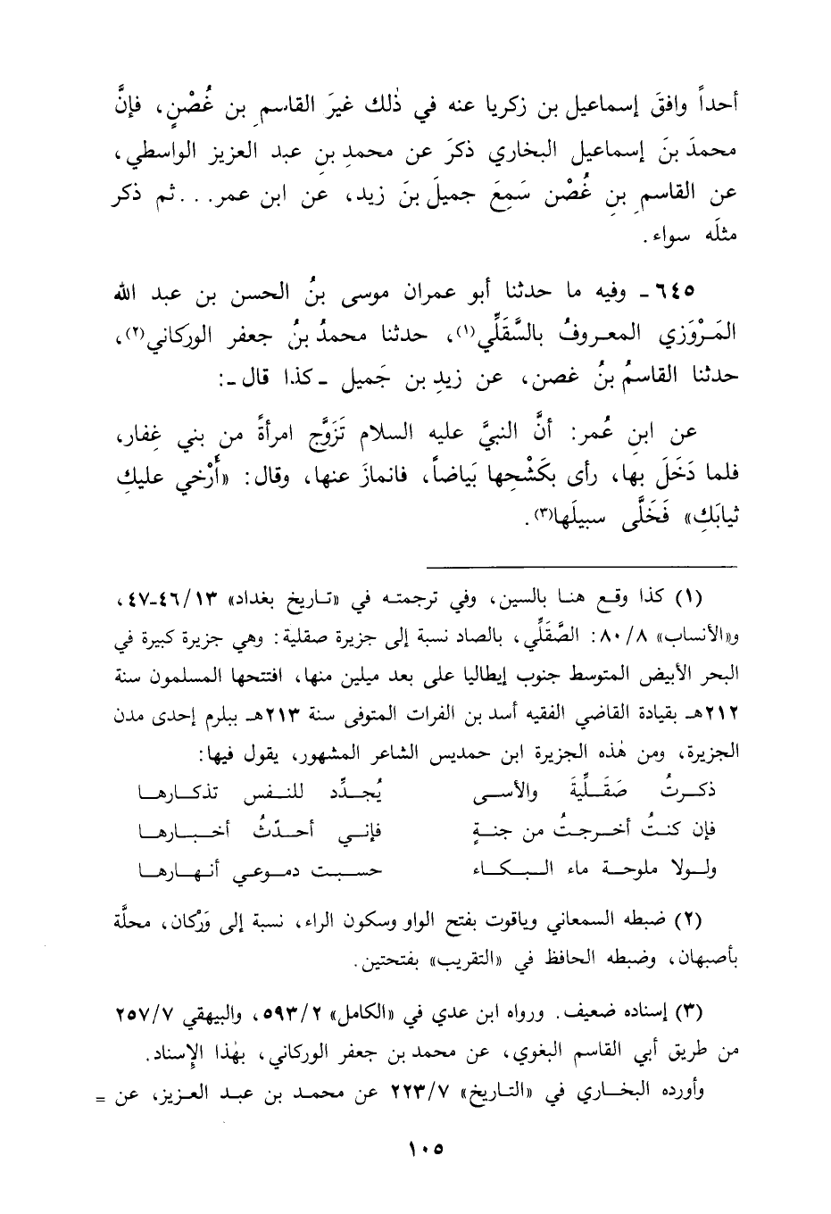 645 - وَفِيهِ مَا حَدَّثَنَا أَبُو عِمْرَانَ مُوسَى بْنُ الْحَسَنِ بْنِ عَبْدِ اللهِ الْمَرْوَزِيُّ الْمَعْرُوفُ بِالسَّقَلِّيِّ حَدَّثَنَا مُحَمَّدُ بْنُ جَعْفَرٍ الْوَرْكَانِيُّ، حَدَّثَنَا الْقَاسِمُ بْنُ غُصْنٍ، عَنْ زَيْدِ بْنِ جَمِيلٍ كَذَا قَالَ: عَنِ ابْنِ عُمَرَ أَنَّ النَّبِيَّ عَلَيْهِ السَّلَامُ تَزَوَّجَ امْرَأَةً مِنْ بَنِي غِفَارٍ فَلَمَّا دَخَلَ بِهَا رَأَى بِكَشْحِهَا بَيَاضًا فَانْمَازَ عَنْهَا قَالَ: " أَرْخِي عَلَيْكِ ثِيَابَكِ " فَخَلَّى سَبِيلَهَا -[106]- وَأَمَّا مَنْ خَالَفَهُمَا فِي ذَلِكَ عَنْ جَمِيلِ بْنِ زَيْدٍ فَإِنَّ مِنْهُمْ عَبَّادَ بْنَ الْعَوَامِّ ذَكَرَهُ عَنْ جَمِيلٍ قَالَ: سَمِعْتُ كَعْبَ بْنَ زَيْدٍ الْأَنْصَارِيَّ