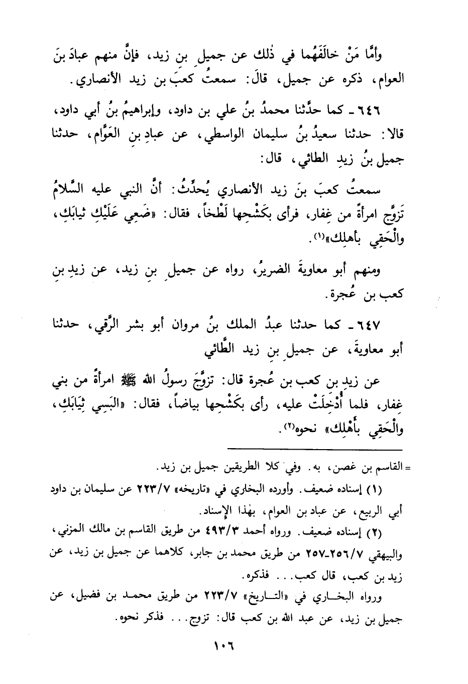 646 - كَمَا حَدَّثَنَا مُحَمَّدُ بْنُ عَلِيِّ بْنِ دَاوُدَ، وَإِبْرَاهِيمُ بْنُ أَبِي دَاوُدَ قَالَا: حَدَّثَنَا سَعِيدُ بْنُ سُلَيْمَانَ الْوَاسِطِيُّ، عَنْ عَبَّادِ بْنِ الْعَوَّامِ، حَدَّثَنَا جَمِيلُ بْنُ زَيْدٍ الطَّائِيُّ قَالَ: سَمِعْتُ كَعْبَ بْنِ زَيْدٍ الْأَنْصَارِيَّ يُحَدِّثُ أَنَّ النَّبِيَّ عَلَيْهِ السَّلَامُ تَزَوَّجَ امْرَأَةً مِنْ غِفَارٍ فَرَأَى بِكَشْحِهَا لَطْخًا فَقَالَ: " ضَعِي عَلَيْكِ ثِيَابَكِ، وَالْحَقِي بِأَهْلِكِ " وَمِنْهُمْ أَبُو مُعَاوِيَةَ الضَّرِيرُ رَوَاهُ عَنْ جَمِيلِ بْنِ زَيْدٍ، عَنْ زَيْدِ بْنِ كَعْبِ بْنِ عُجْرَةَ